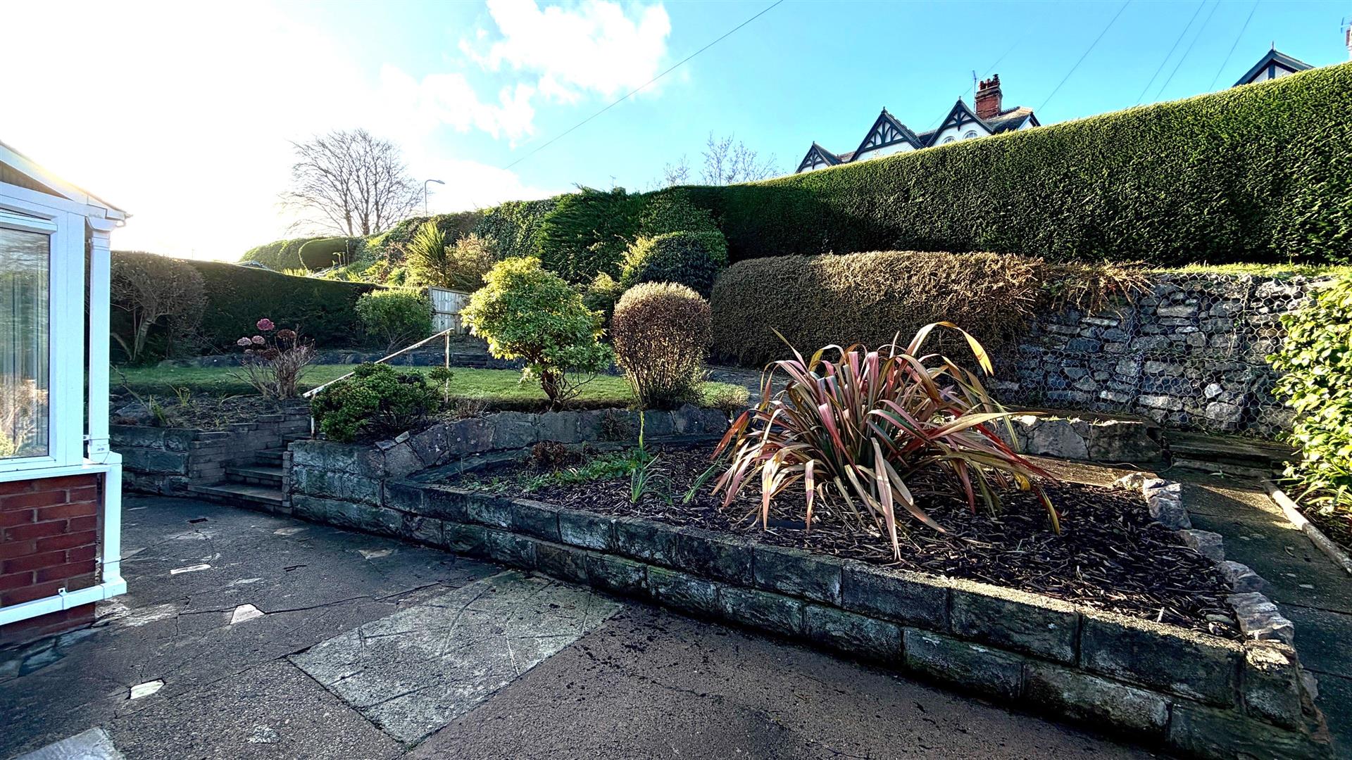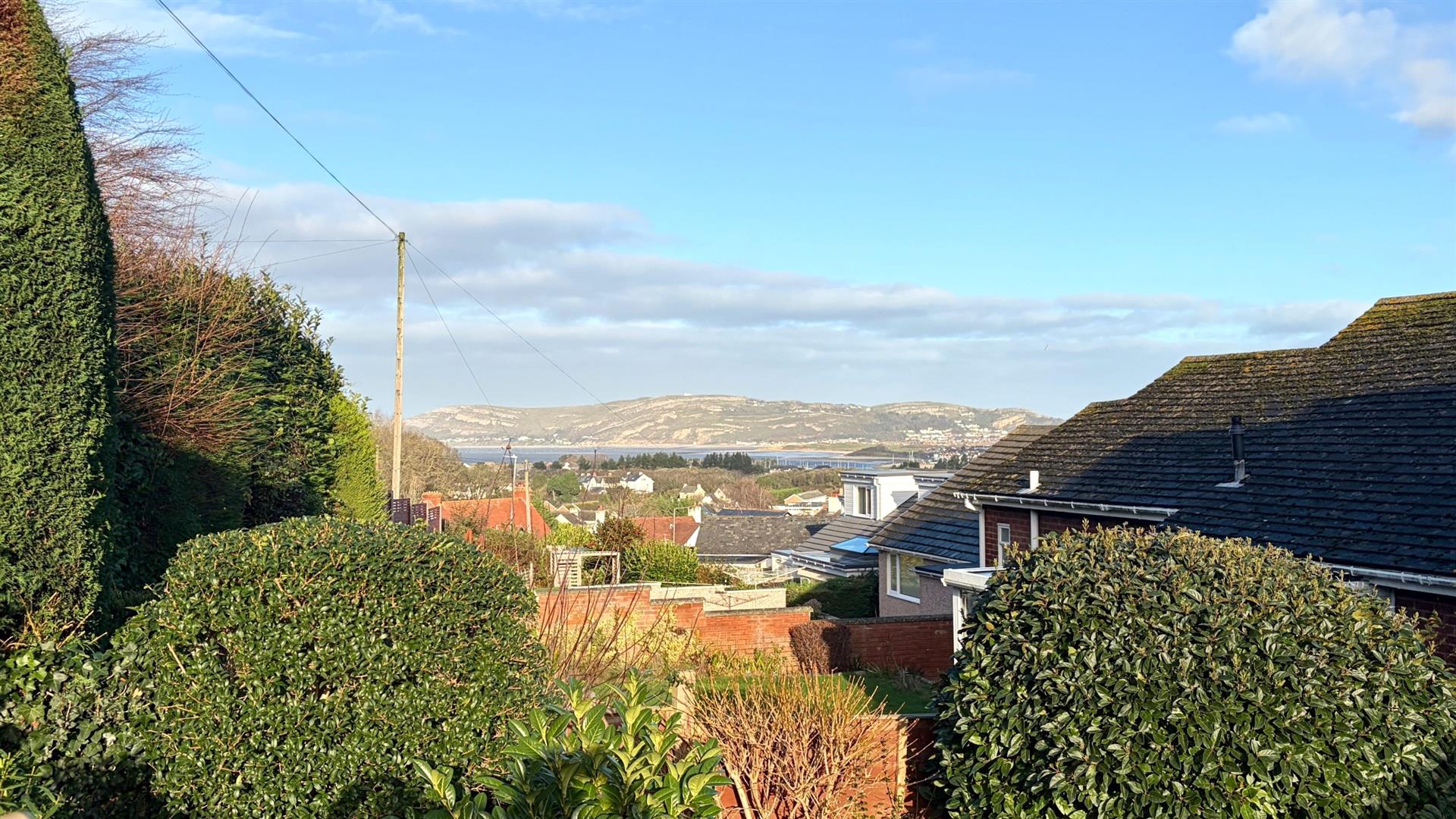 REAR GARDENWith lawn, flower beds, shrubs, patio area and distant view to the West Shore and Great Orme.