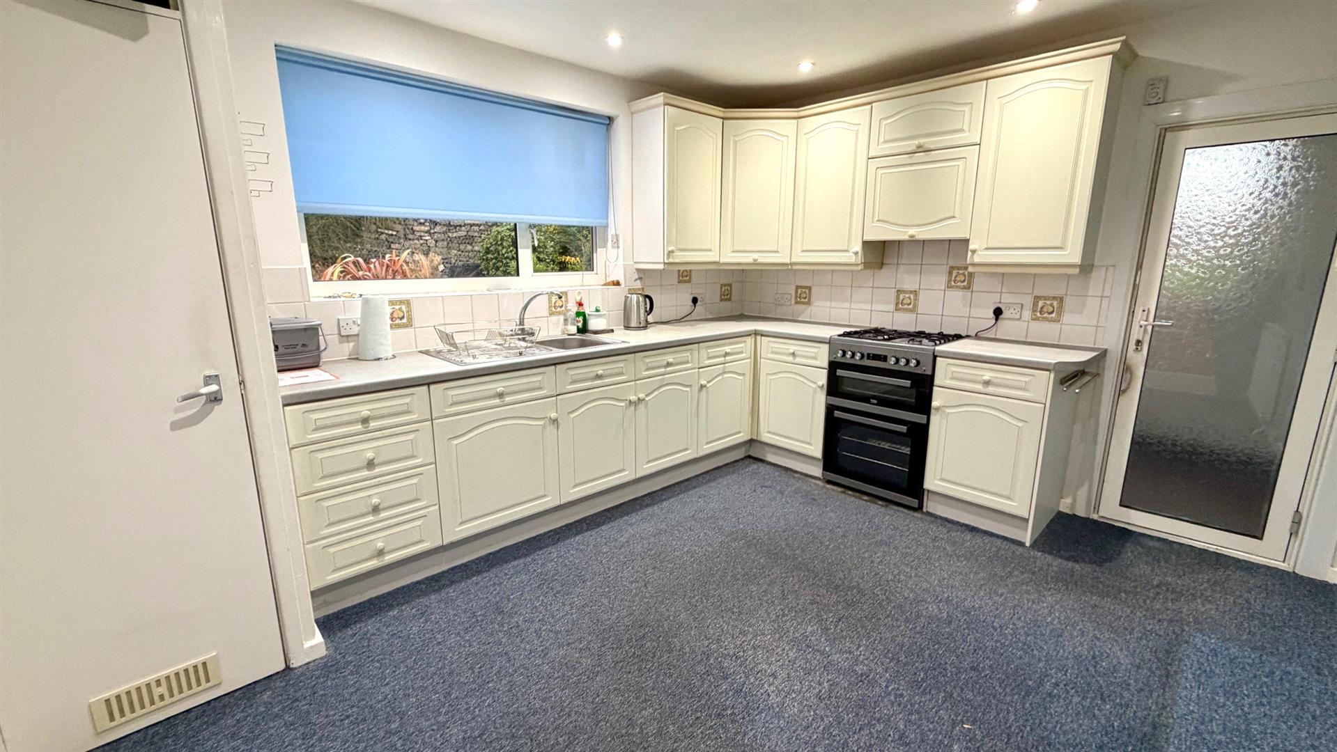 Fitted range of white fronted base, wall and drawer units, inset single drainer sink unit and mixer tap, round edge work tops, wall tiling, cupboard housing washing machine, 'Vaillant' central heating and hot water boiler, recessed downlighters to ceiling, telephone point, radiator, upvc double glazed window.