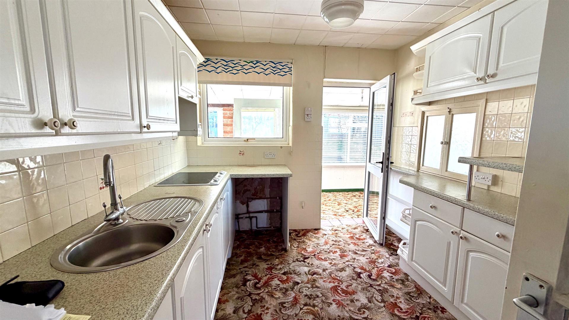 Fitted range of base, wall and drawer units with round edge worktops, inset single drainer sink unit and mixer tap, cupboard housing hot water tank, 4 ring 'Stoves' hob with cooker hood over, plumbing for a washing machine, wall tiling, upvc double glazed door to:-