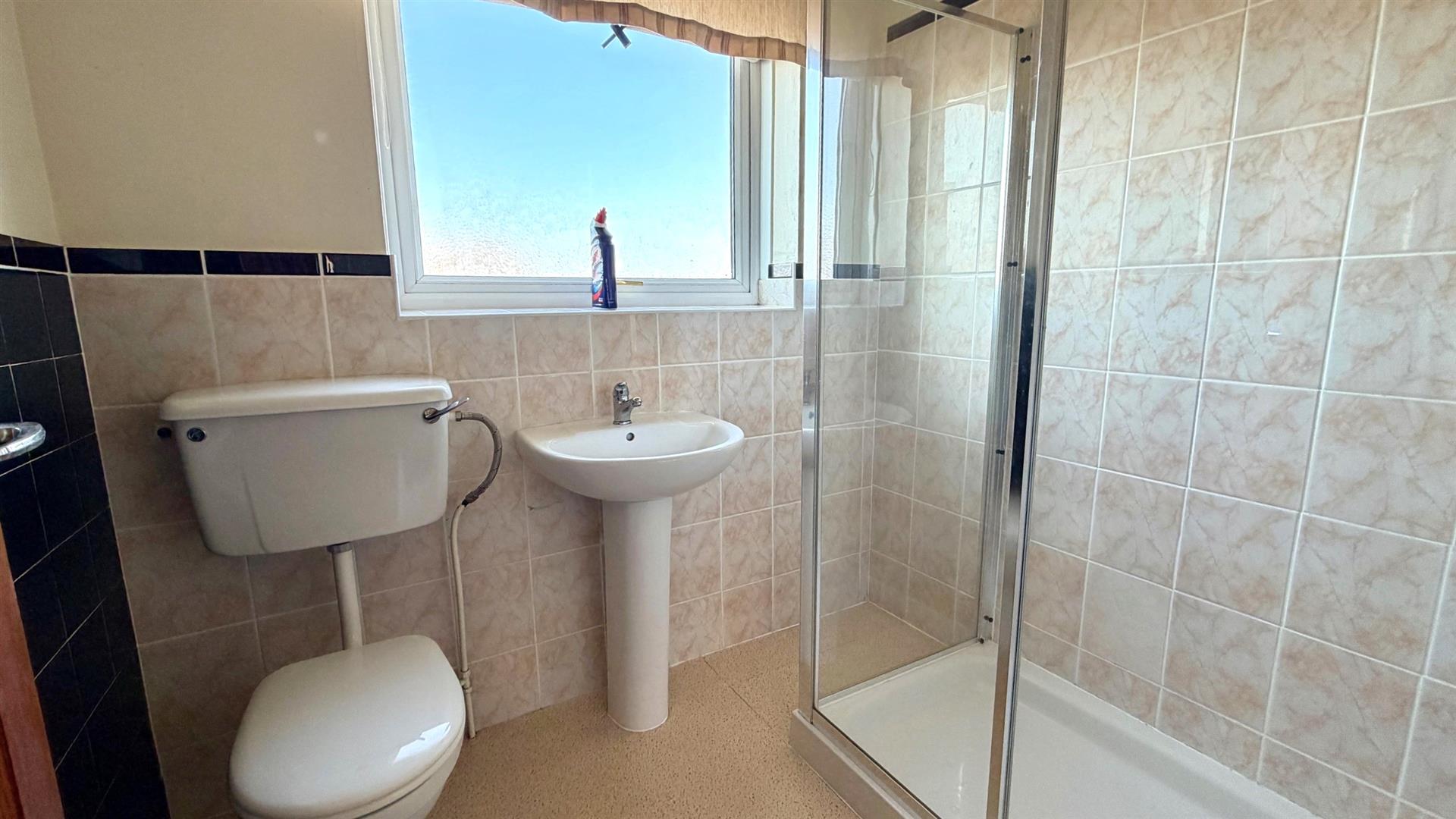 3-PIECE SHOWER ROOMWith double shower stall, pedestal wash hand basin, low flush w.c, wall tiling, lino flooring.