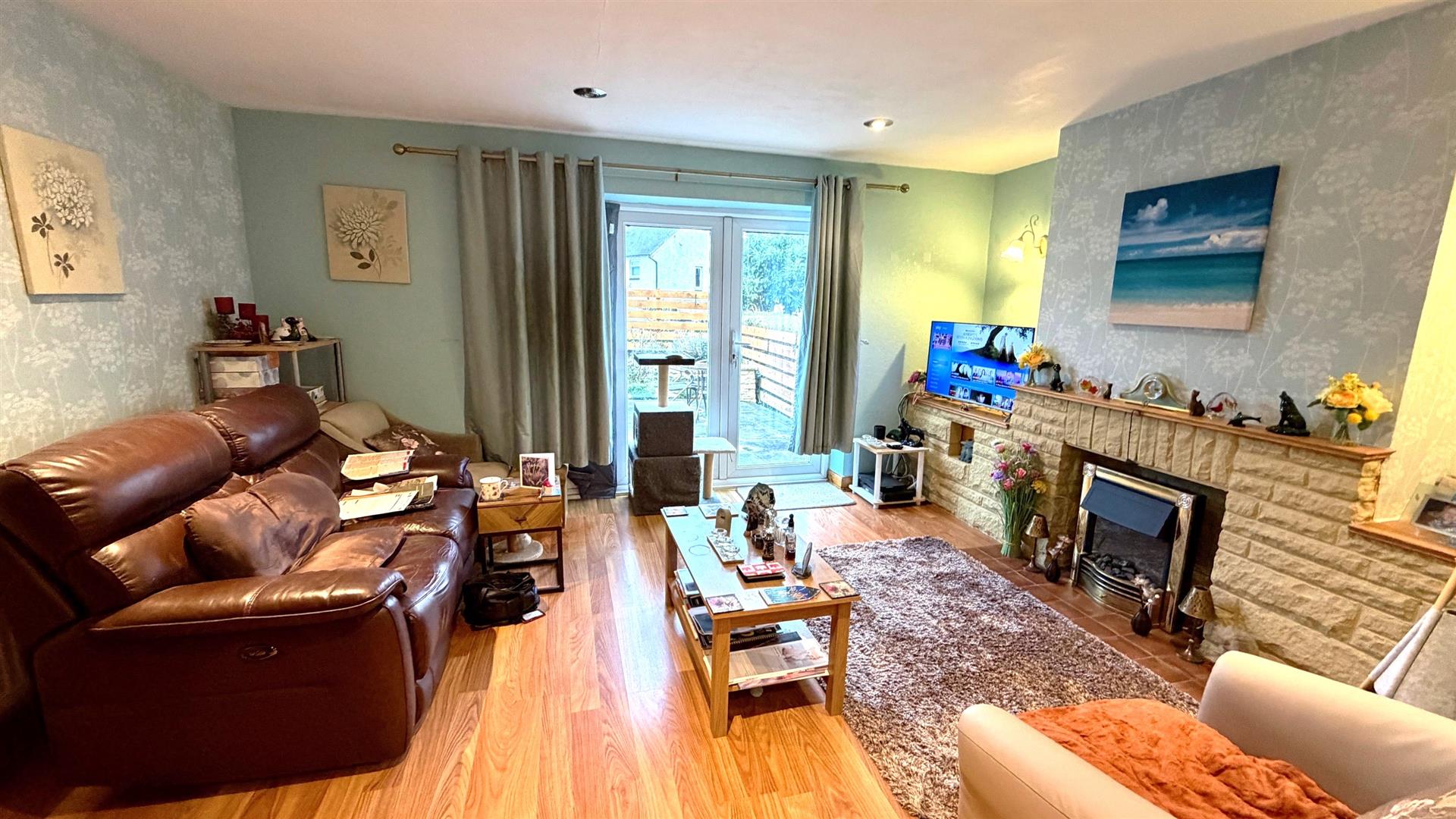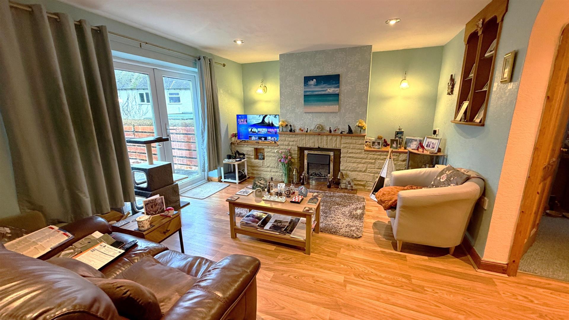 Fire surround with shelving. Double doors to the rear garden, spotlights to ceiling, radiator. t.v point, telephone point.
