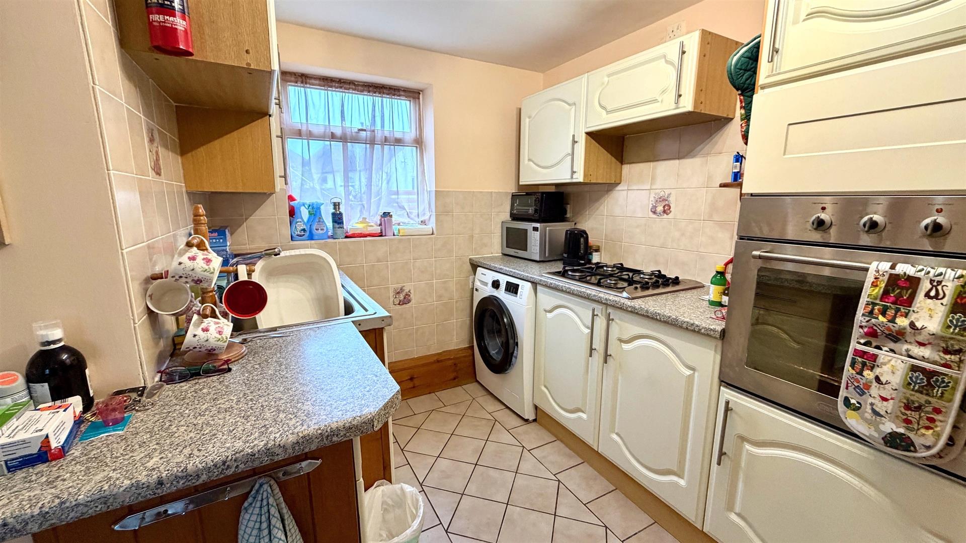Fitted with a range of base and wall units with roundedge worktops, integral oven with 4 ring gas hob, single drainer sink with mixer tap, space for fridge/freezer, plumbing for a washing machine, floor tiling, double glazed window to rear.