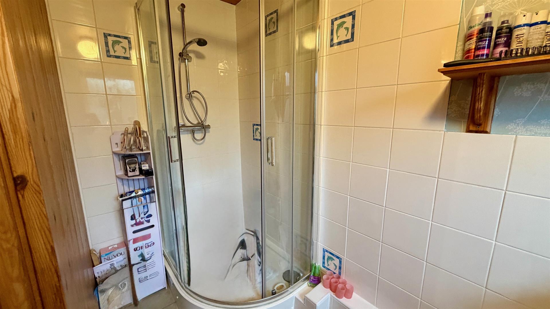 3-PIECE SHOWER ROOMShower stall, pedestal wash hand basin and low level flush w.c, wall tiling, cupboard housing boiler, double glazed obscure glass window the rear.