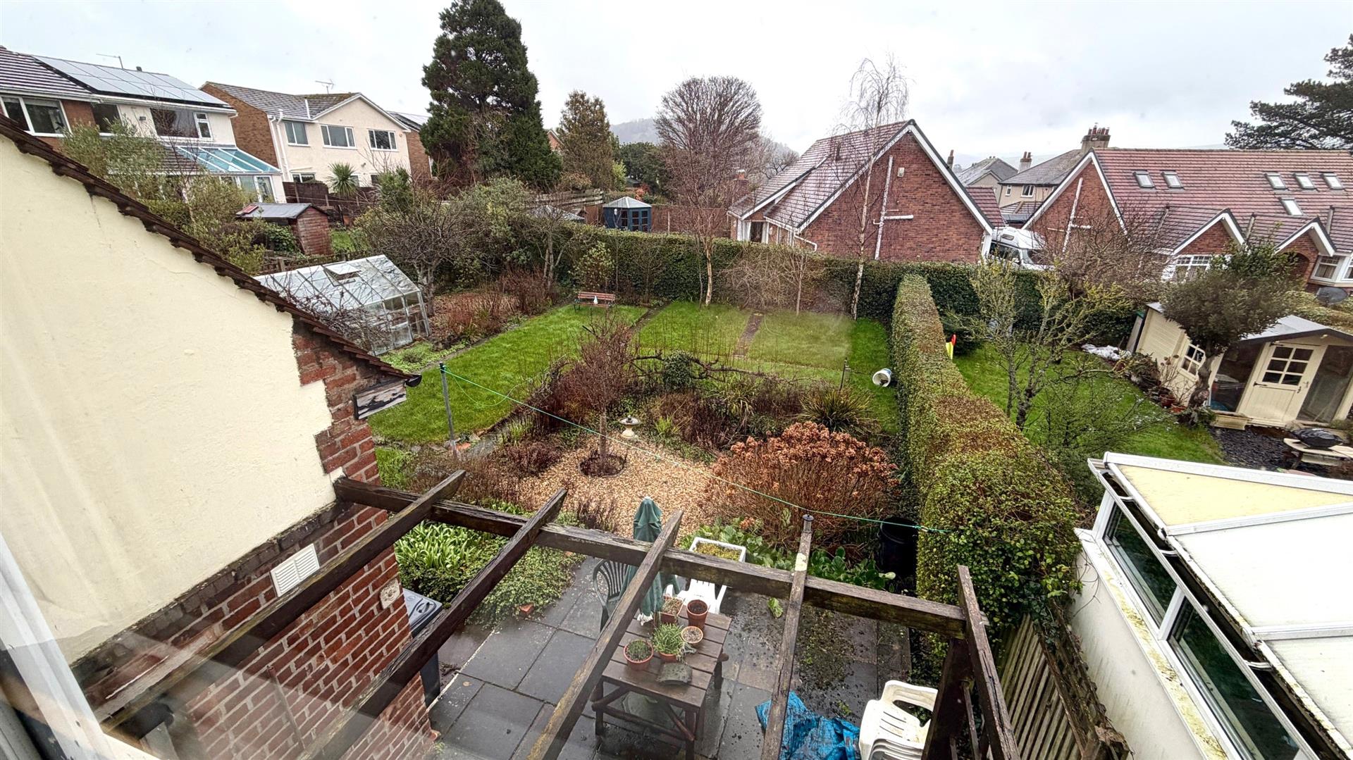 LARGE DOUBLE WIDTH REAR GARDENComprising paved seating area, decorative chippings, shrubs, trees, lawned areas, seating areas, fruit trees, aluminium framed greenhouse.