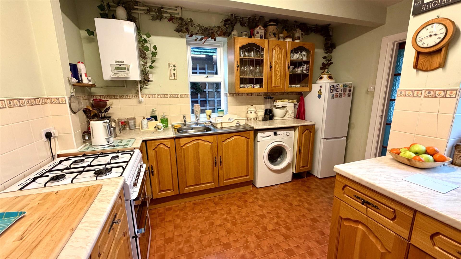 Fitted range of oak effect base, wall, drawer and glass fronted units with round edge worktops, inset single drainer sink unit, space for cooker, plumbing for automatic washing machine, wall tiling, space for fridge/freezer, wall mounted 'Vaillant' central heating boiler serving heating and hot water, telephone point, double aspect upvc double glazed windows, access door to rear garden.