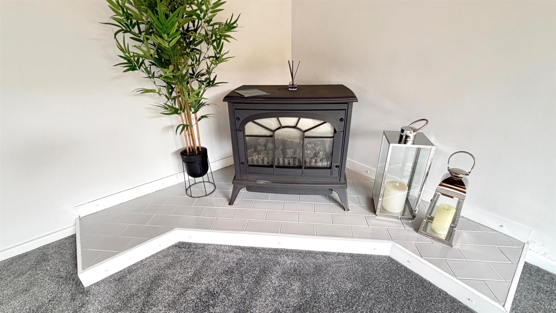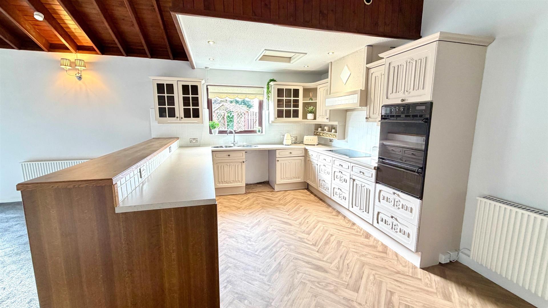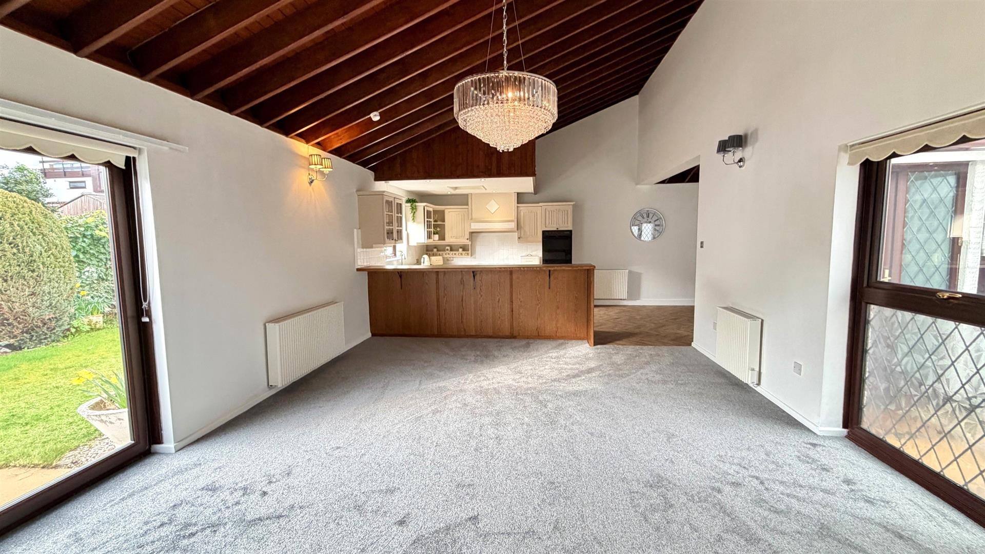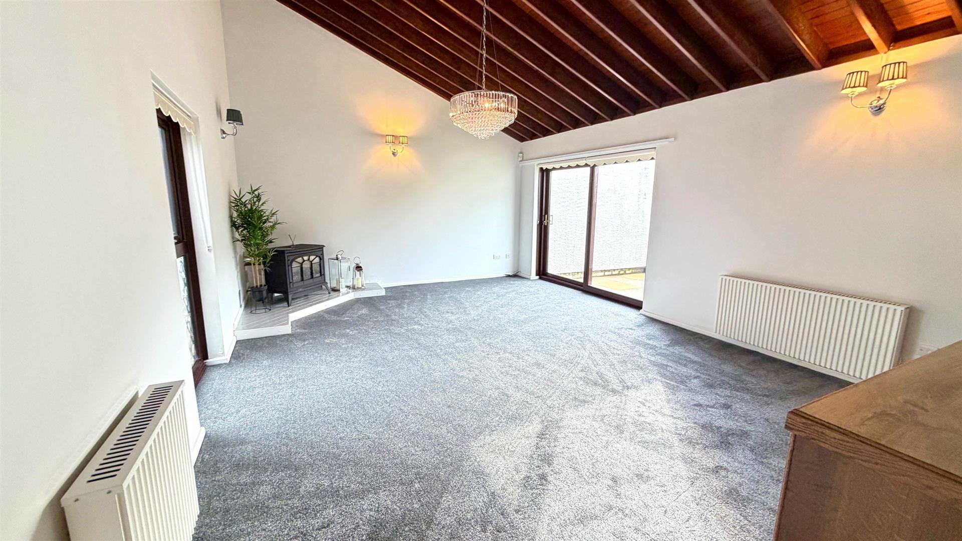 DOUBLE ASPECT LOUNGE AREAWith gas stove fire, 3 wall light points, 2 'Fischer' electric radiators, Cathedral style ceiling, upvc double glazed window and sliding patio door to rear garden.