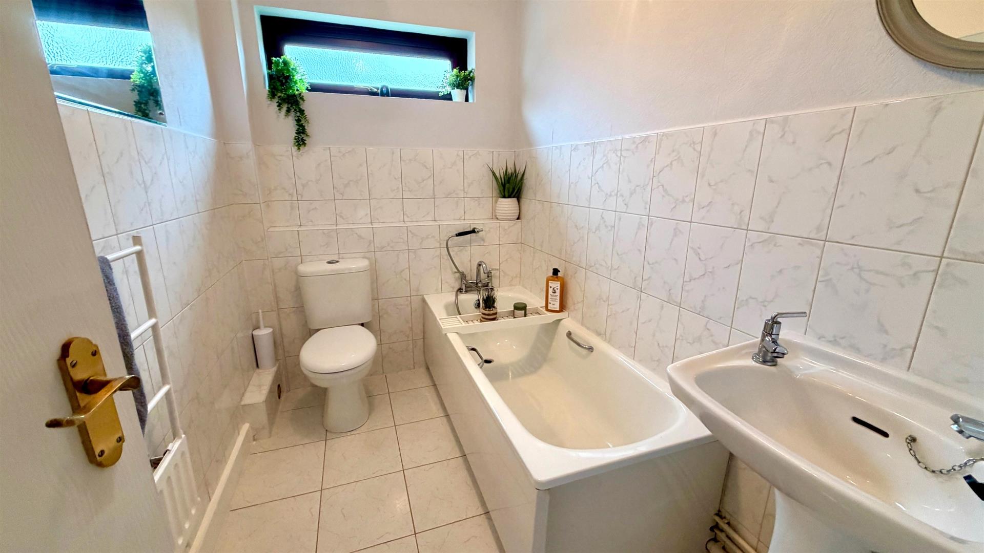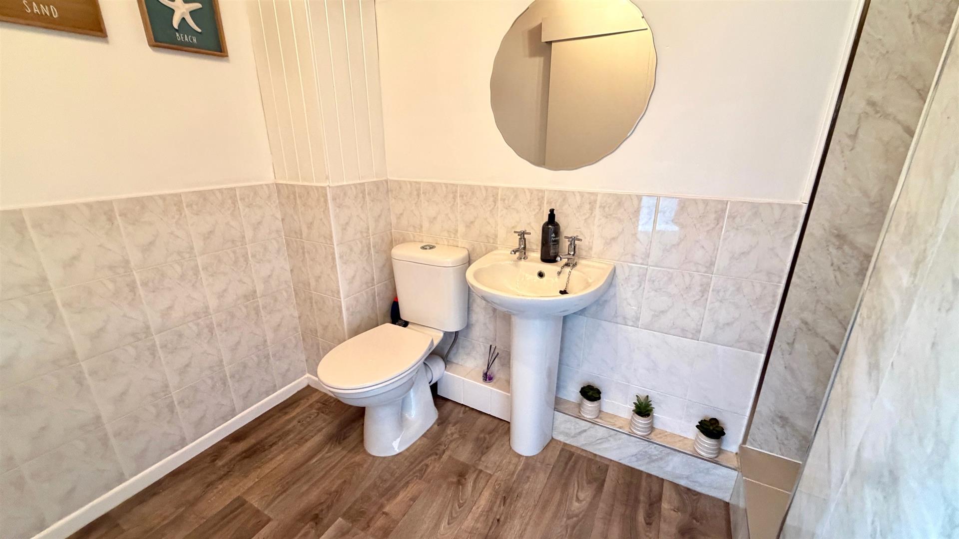 GROUND FLOOR BATHROOMIn White comprising panel bath with shower attachment, pedestal wash hand basin and close coupled w.c, wall tiling, floor tiling, upvc double glazed window, electric radiator/towel warmer.
