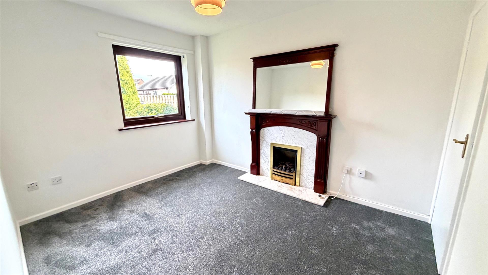 Fire surround with marble back and hearth, 'Living Flame' coal effect fire, upvc double glazed window, understairs cupboards.