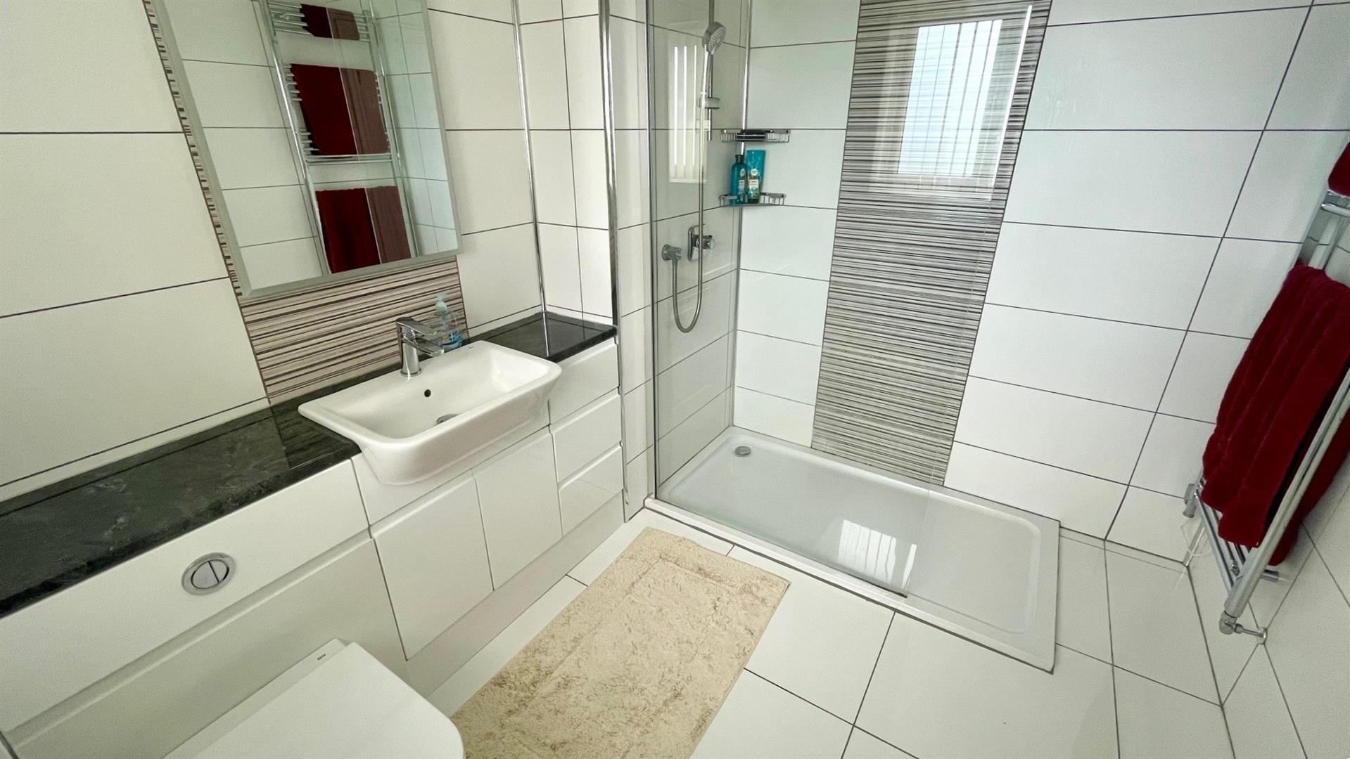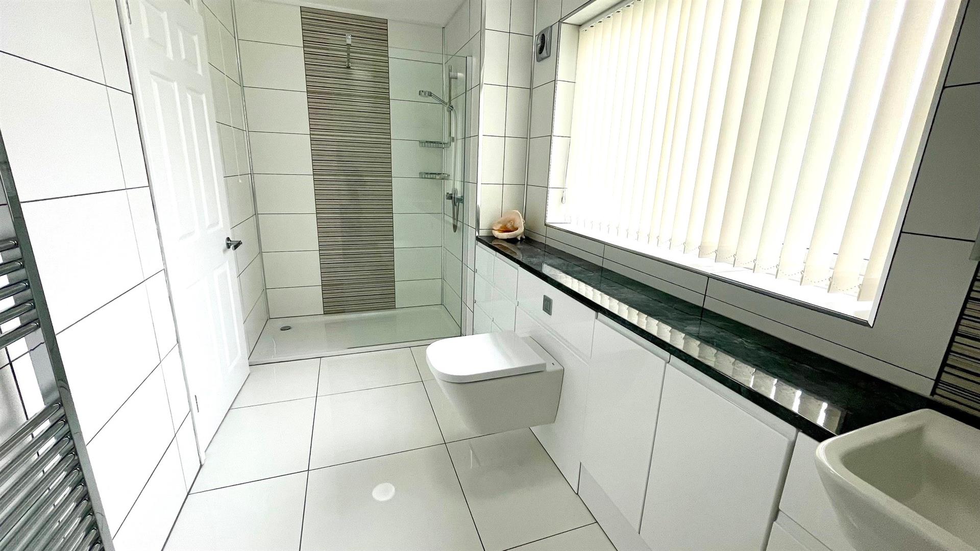 In white, comprises double width shower with screen and decorative tiling, mains shower, wash hand basin with decorative splashback and display shelving, drawers, close coupled wc, extractor, ceramic floor tiling, ladder style towel rail, upvc double glazed window, mirror with light.
