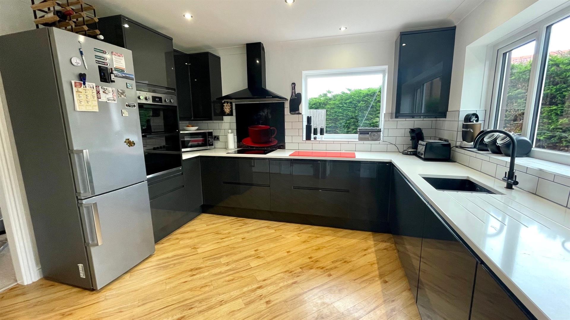 Refitted range of grey gloss fronted base wall and drawer units with quartz silestone cream worktops with bevelled edges, inset 1½ bowl sink unit with mixer taps, inset 'Lamana' dishwasher and large corner carousel, pull out shelving, integrated double 'Lamana' electric oven and 4 ring ceramic 'Lamana' hob with decorative splashback, cooker hood over, space for fridge/ freezer, wood effect flooring, coving, recessed downlighters to ceiling, wall tiling, double aspect upvc double glazed windows, ladder style towel rail.