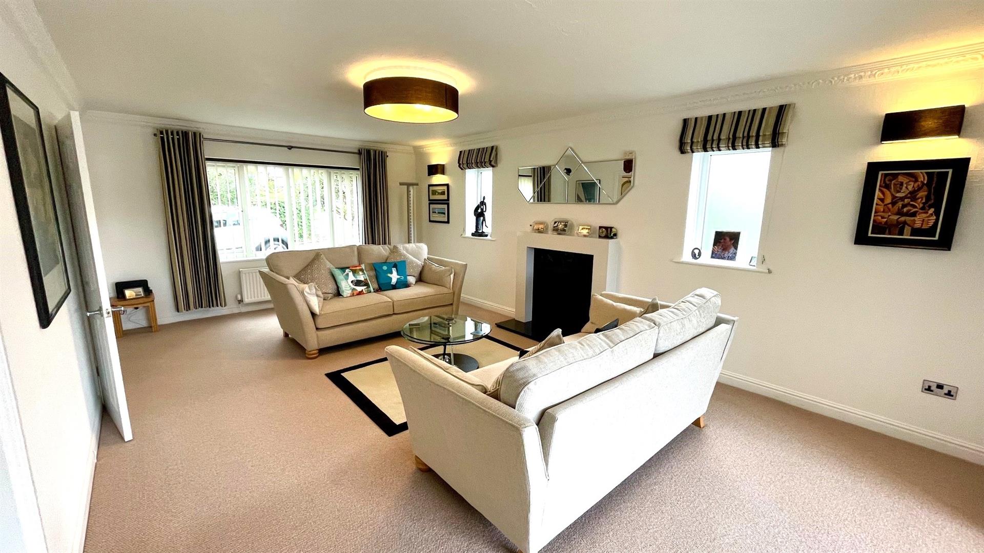 Marble fire surround with granite back and hearth inset, gas coal effect fire, decorative coving, tv point, 2 double radiators, upvc double glazed window to front opening through to: