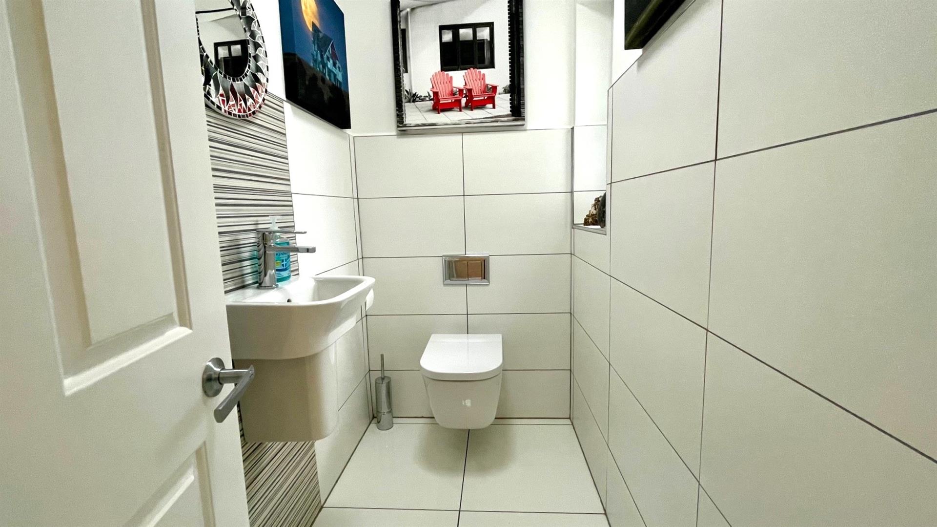2 PIECE TILED CLOAKROOMTiled walls with decorative splashback, wash hand basin and mixer tap, close coupled wc, ladder style towel rail, coving, upvc double glazed window with tiled display sill.