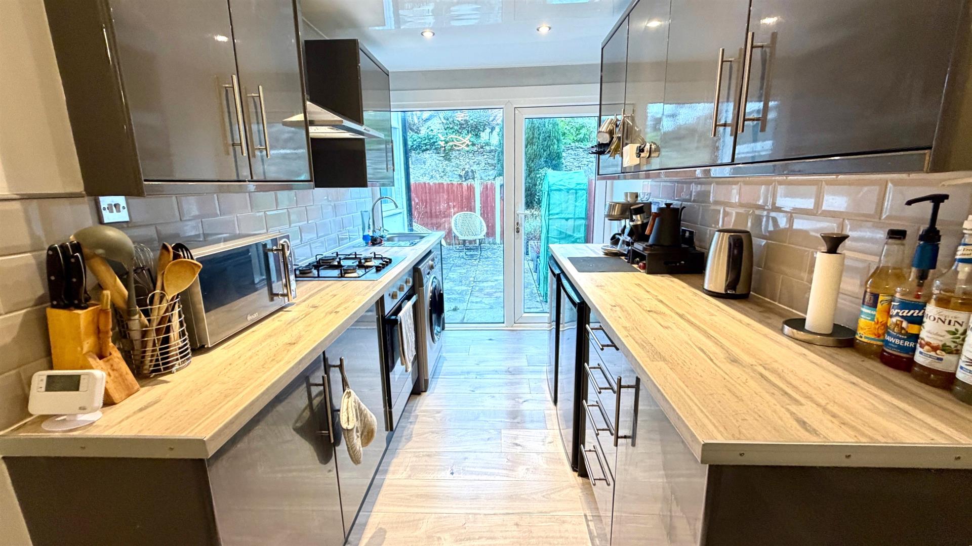 Fitted range of grey gloss fronted base, wall and drawer units with round edge wood effect worktops, inset "Cooke & Lewis" electric oven, 4-ring gas hob and stainless steel canopy over, single drainer sink unit, plumbing for washing machine and space for fridge freezer, wall tiling, wood effect laminate flooring, plastic cladding to ceiling with recessed downlighters, UPVC double glazed door to garden.