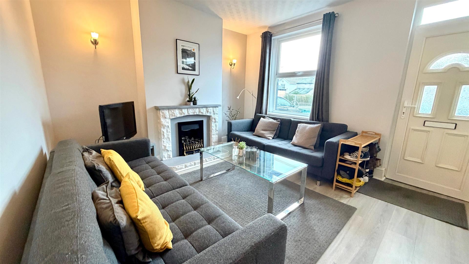 Stone fire surround and hearth with inset gas coal effect fire, 4 wall light points, laminate flooring, UPVC double glazed window, double radiator, door to:-