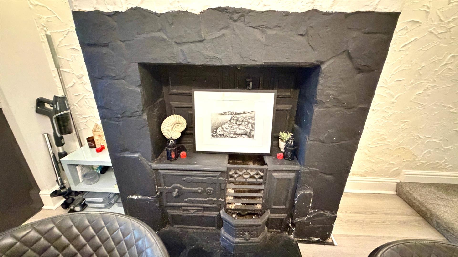 Staircase to first floor, chimney breast with inset decorative "Triplex Grate", plate rack, 2 wall light points, laminate flooring, double radiator.