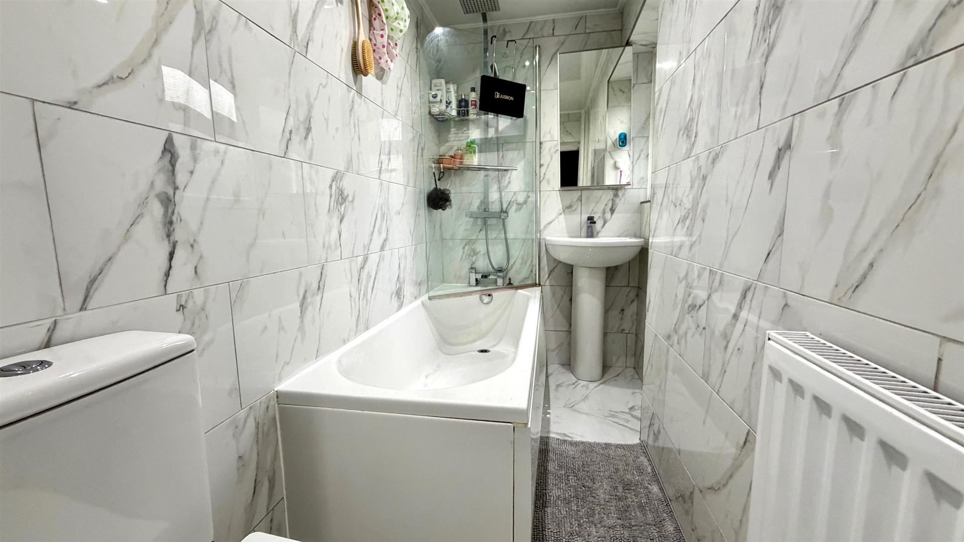 GROUND FLOOR BATHROOMWhite suite comprising panel bath with mixer tap and mains shower over with drench shower head, pedestal wash hand basin, close couple W.C., ceramic tiled walls and floors, plastic cladding to ceiling with recessed downlighters, radiator, UPVC double glazed window.