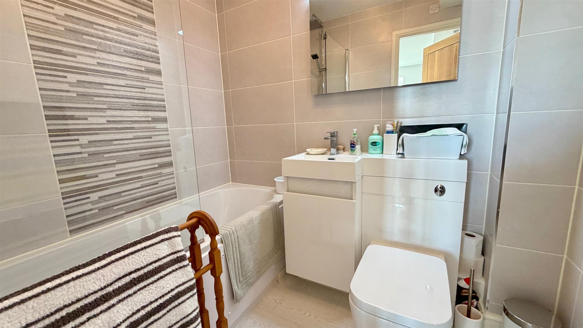 TILED 3 PIECE BATHROOMIn white comprising panel bath with mixer tap, mains shower with twin shower heads including drench shower, vanity wash hand basin and display shelf, closed couple w.c., wall mounted mirror with light, electric heater, towel rail, spotlights, laminate flooring.