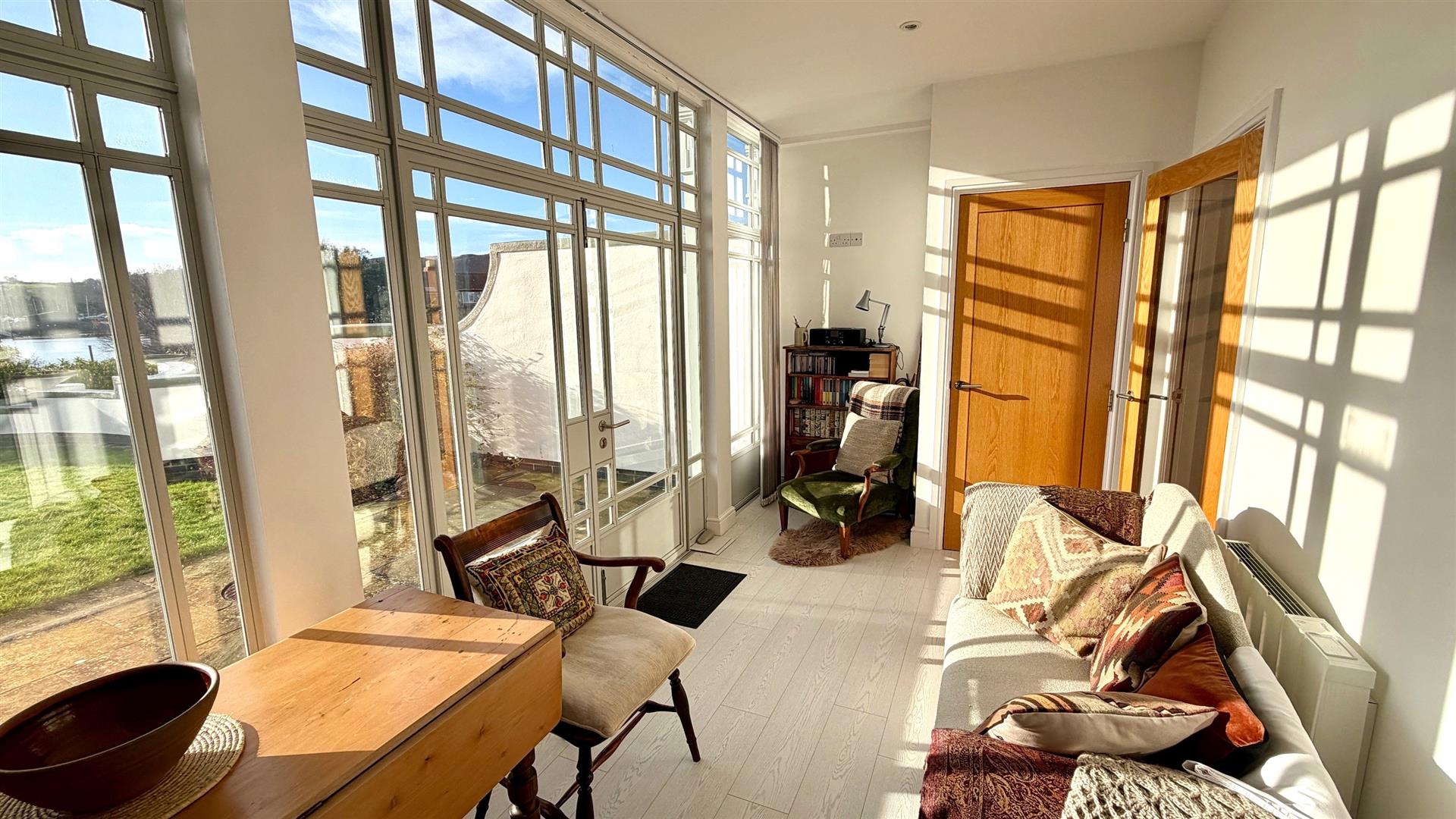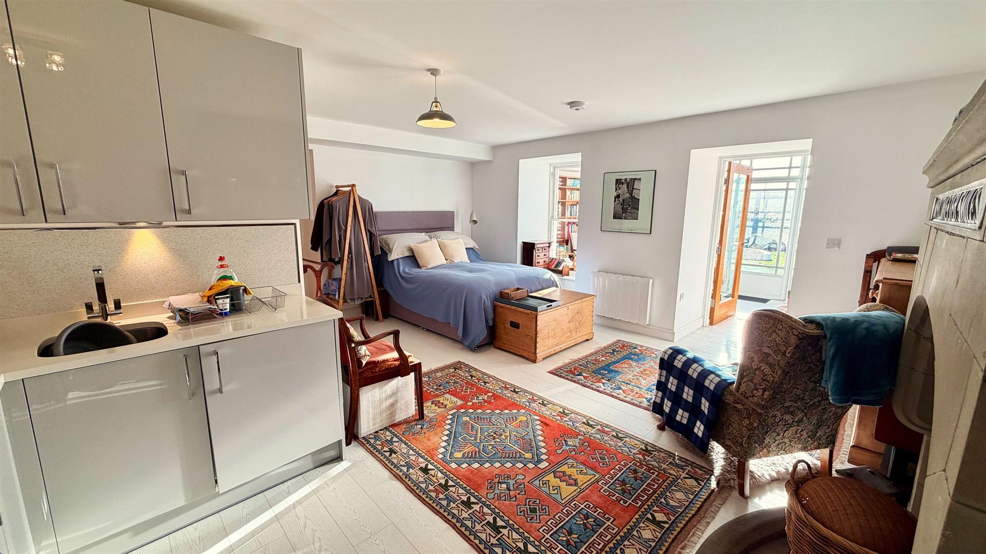 Telephone point, T.V. point, 'Dimplex' electric heater, recessed downlighters, airing cupboard with hot water tank and shelving, laminate flooring, double French doors and sidelights lead to private patio/seating area.