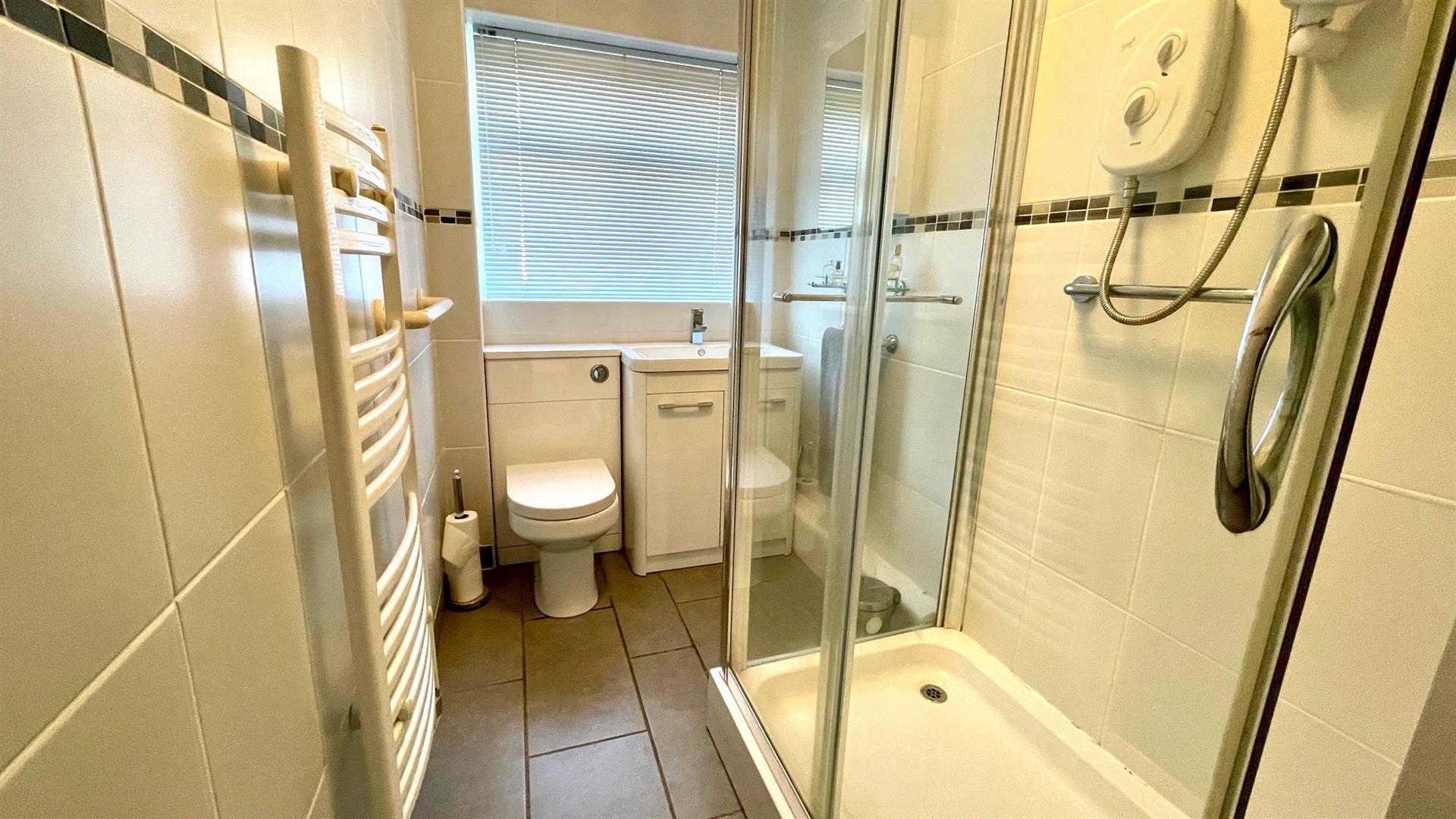 3 PIECE TILED SHOWER ROOMWhite suite comprising double shower stall with 'Triton' electric shower, vanity wash hand basin, closed couple w.c., ladder style towel rail, wall and floor tiling in grey and white, airing cupboard with hot water tank and shelving, recently installed upvc double glazed window.