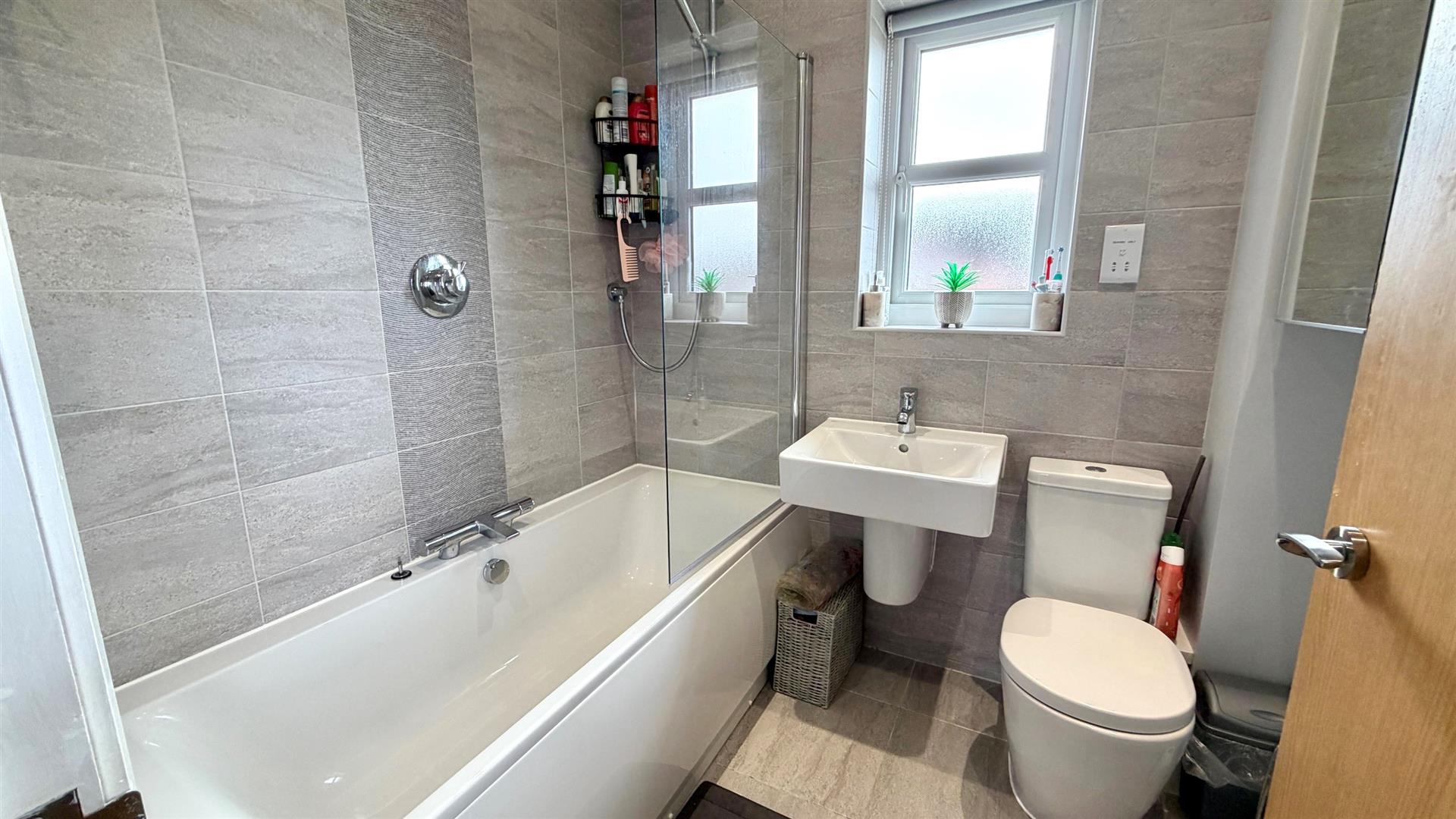 BATHROOMSuite in white comprising panel bath with mains over bath shower, wash hand basin, close coupled w.c., ladder style towel rail, wall tiling, floor tiling.