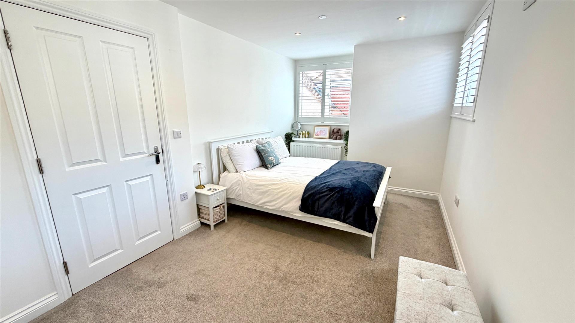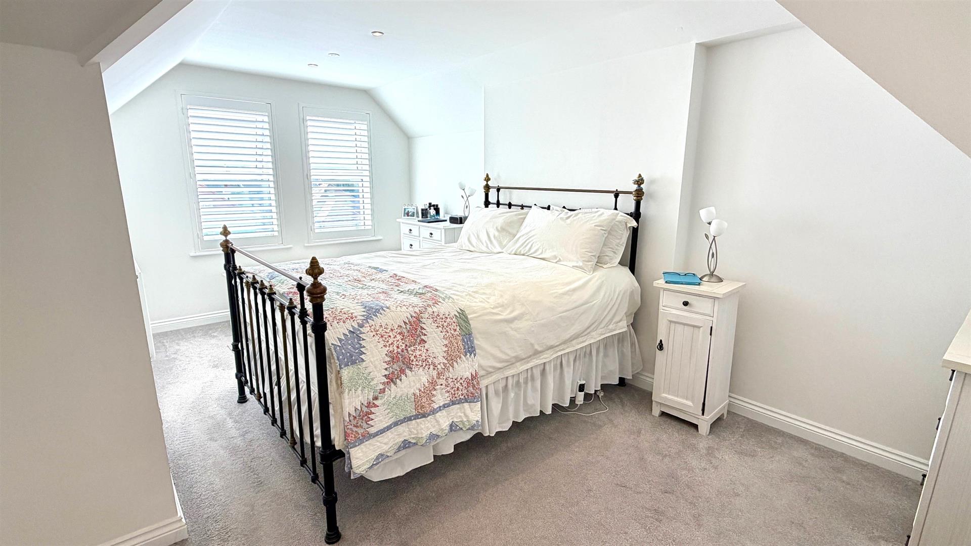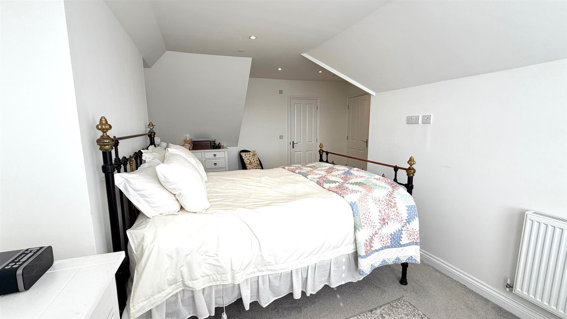 Recessed downlighters to ceiling, part sloping ceiling, 2 x upvc double glazed windows to rear with distant views, tv point, radiator, storage cupboard.