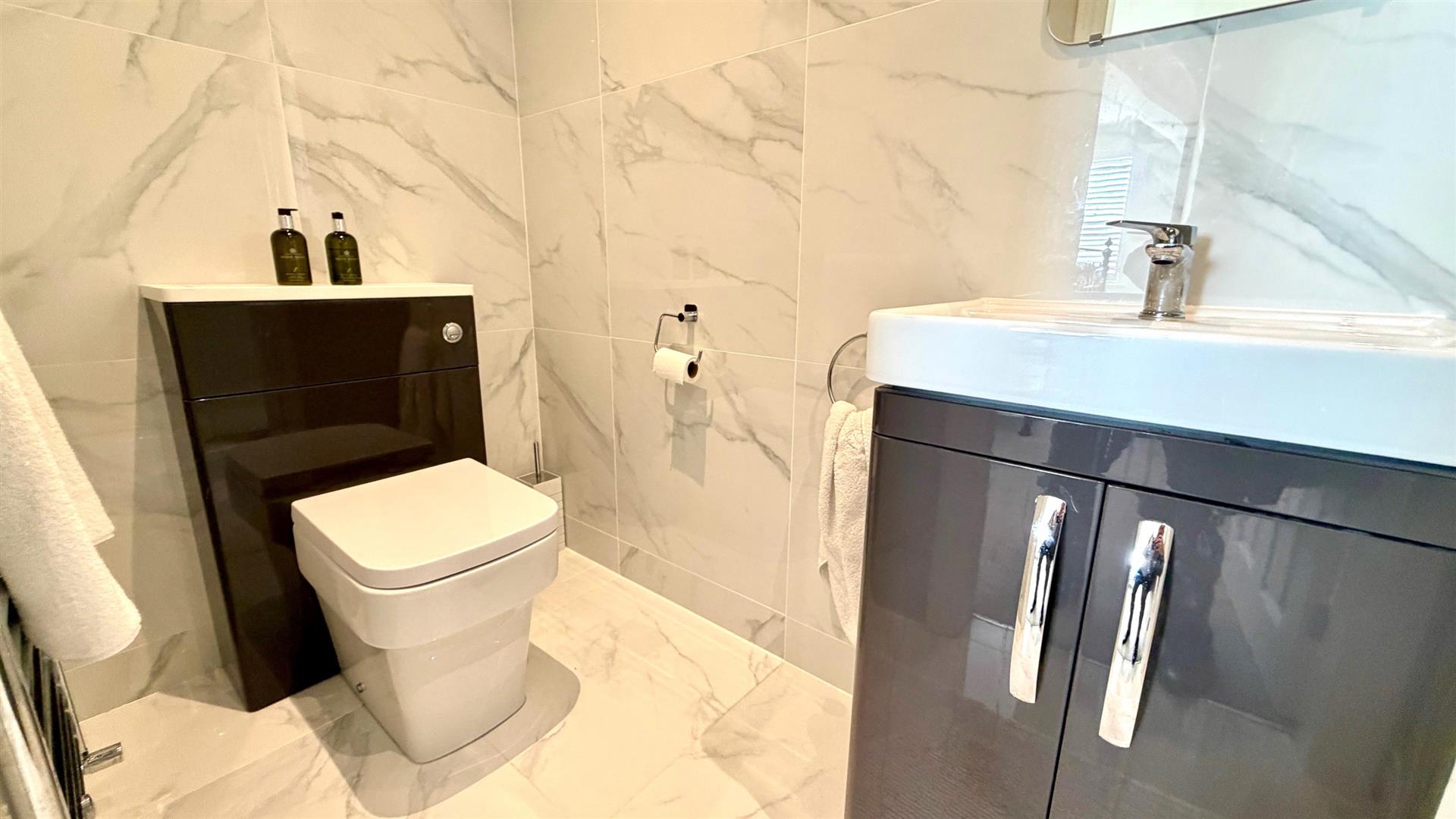EN-SUITE UTILITYWith shelving, plumbing for washing machine, wall mounted 'Baxi' combination central heating and hot water boiler, tiled marble effect flooring.
