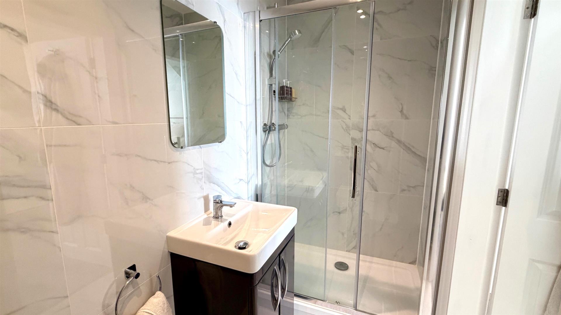 TILED EN-SUITE 3 PIECE SHOWER ROOMComprises double shower stall with sliding door, mains shower, vanity wash hand basin and mixer tap, close coupled wc, display shelf, extractor, recessed ceiling, downlighter, marble effect wall and floor tiling.