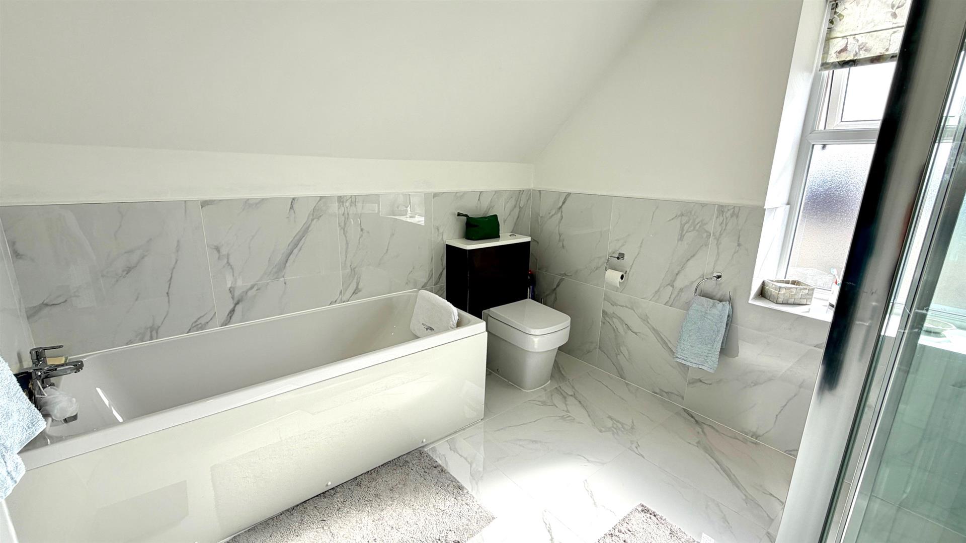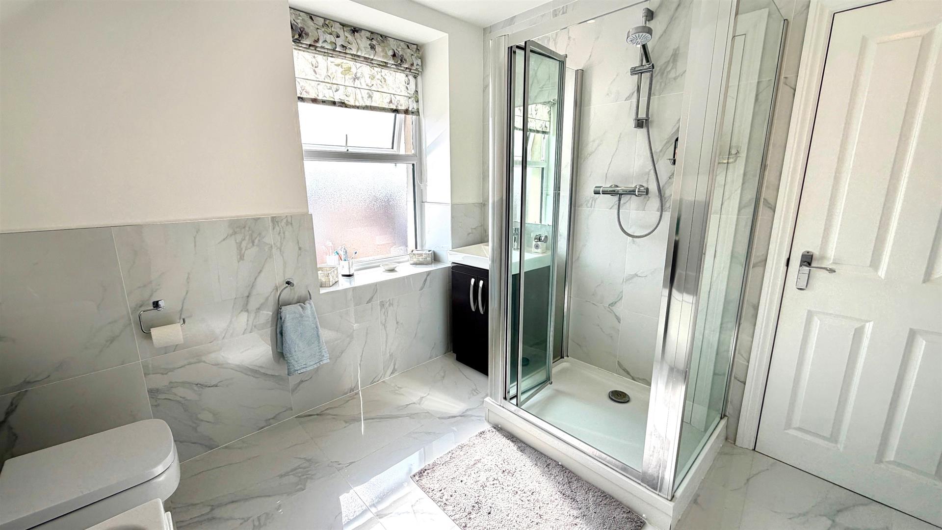 4 PIECE BATHROOMWhite suite comprising panel bath with Mixer Tap, separate shower stall with mains shower, vanity wash hand basin, close coupled wc, display sill, mirror, recessed downlighters, upvc double glazed window, extractor, marble effect wall and floor tiling, ladder style towel rail, upvc double glazed window.
