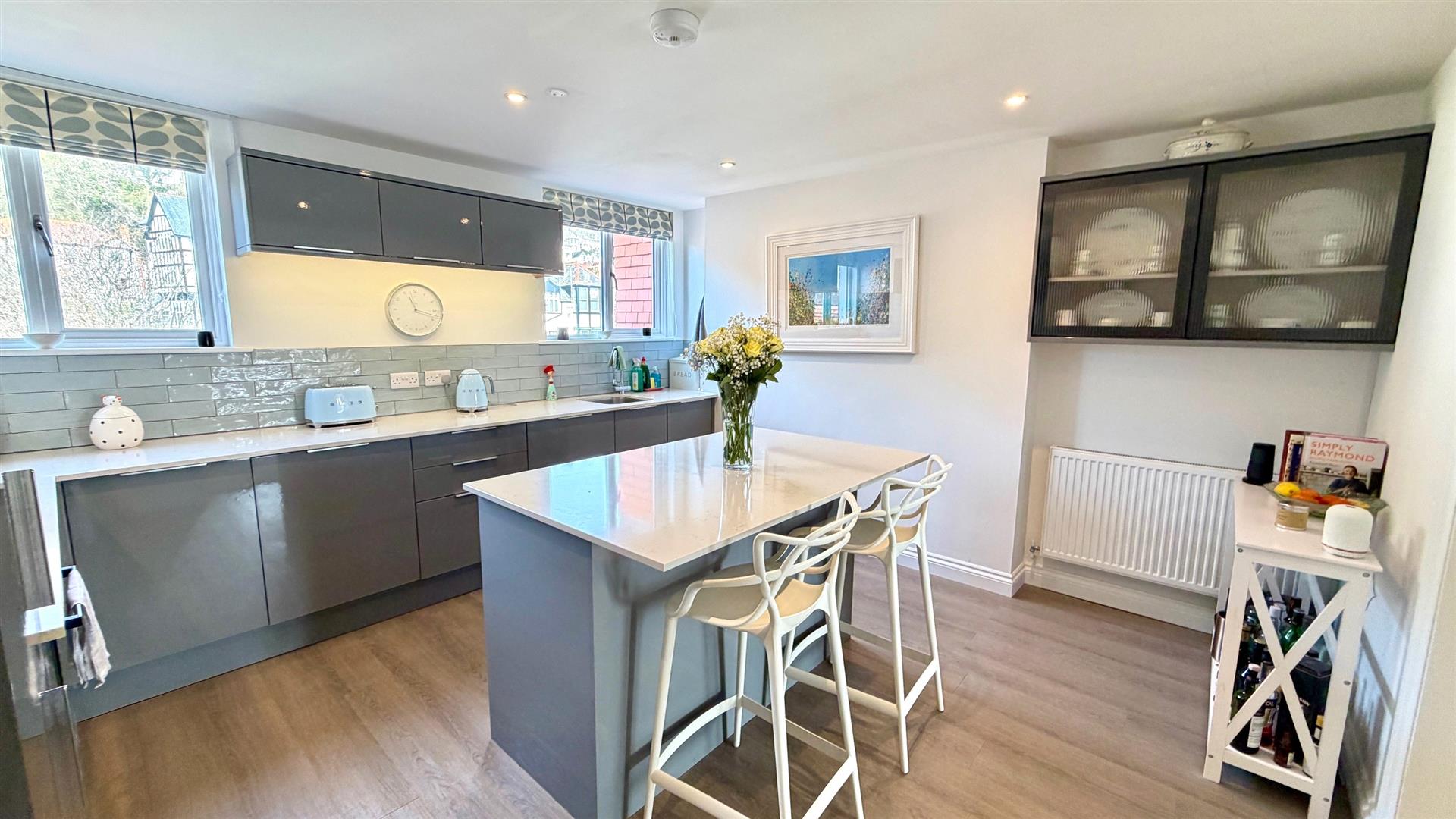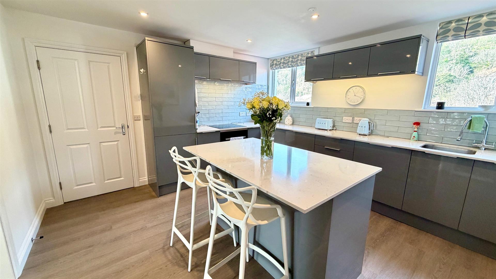 Grey fitted range of gloss fronted base, wall and drawer units with matching central island with breakfast bar with marble effect quartz worktops, integrated appliances include - single drainer sink unit and multi fuel 'Lamana' electric oven and 4 ring electric hob, fridge/freezer, dishwasher, wine rack, wall tiling, under unit lighting, 2 x upvc double glazed windows with views to the lower slopes of the Great Orme, recessed downlighters to ceiling, vinyl flooring, radiator.
