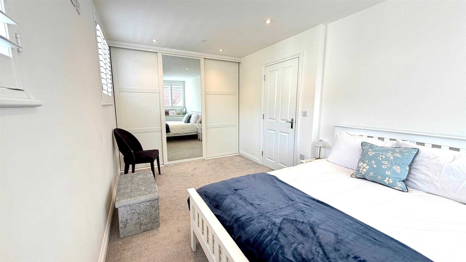 Built in storage cupboards, tv point, recessed ceiling downlighters, double radiator. double opening upvc double glazed doors to Juliette balcony with distant views opening to: