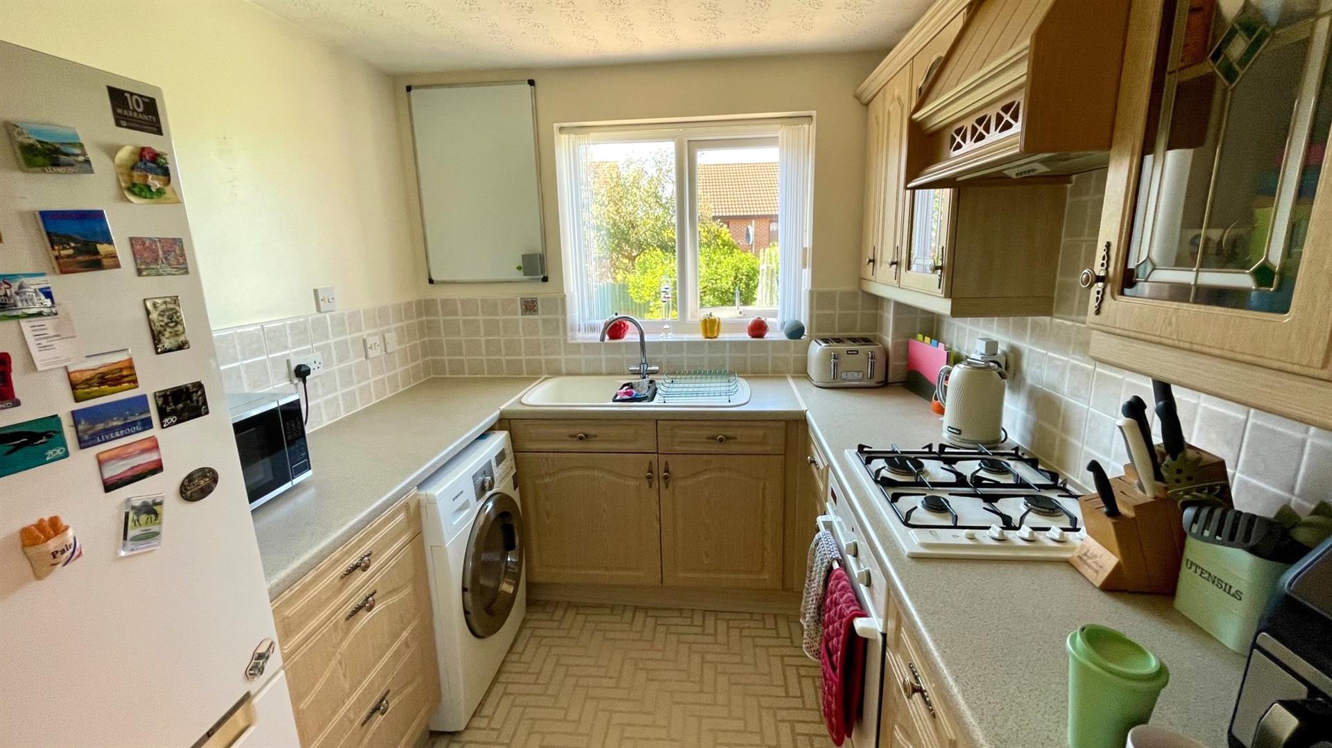 Range of base and wall units with display cabinets, round edge worktops, white moulded 1½ sink unit with matching mixer tap, electric 'Trinity Bendix' oven and 4 ring gas hob, extractor hood, tiled splashbacks, space for washing machine, under stairs storage cupboard, upvc double glazed window, upvc double glazed door to side of property and driveway.