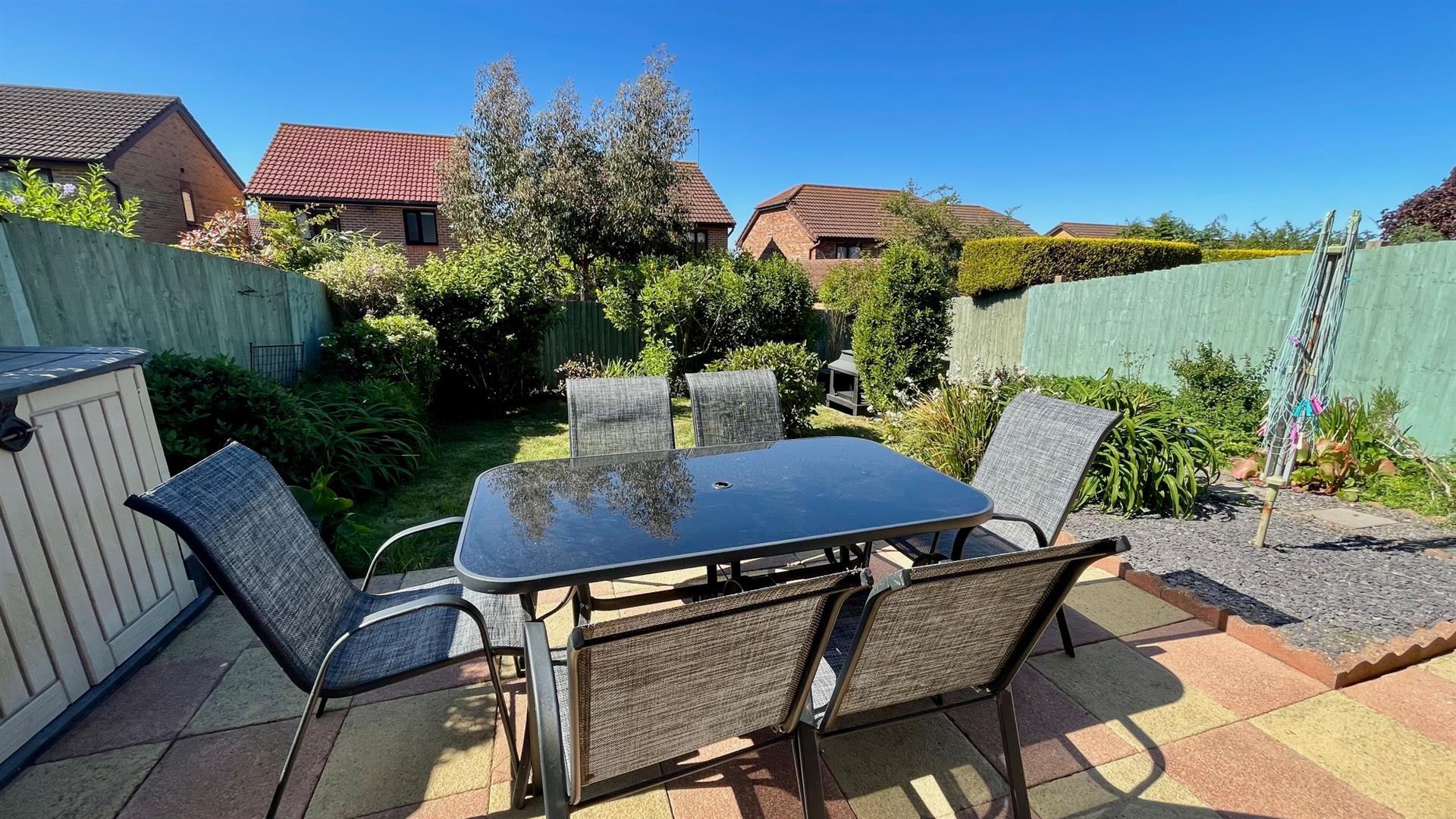 REAR GARDENLawn, shrubs, lawned patio, garden shed and seating area.