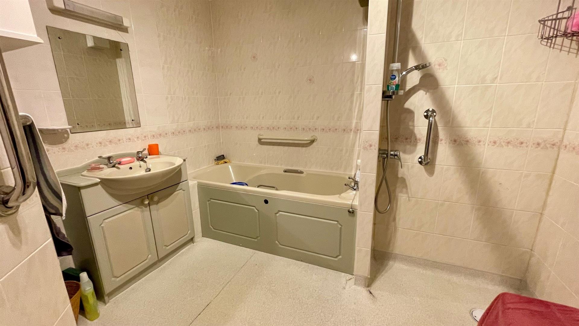 FOUR PIECE BATHROOMPanel bath with panic button, wash hand basin with storage under, low level wc, walk-in shower, tiled walls, coved ceiling, extractor fan, wall mounted 'Creda' electric heater, medicine cabinet, emergency pull cord.