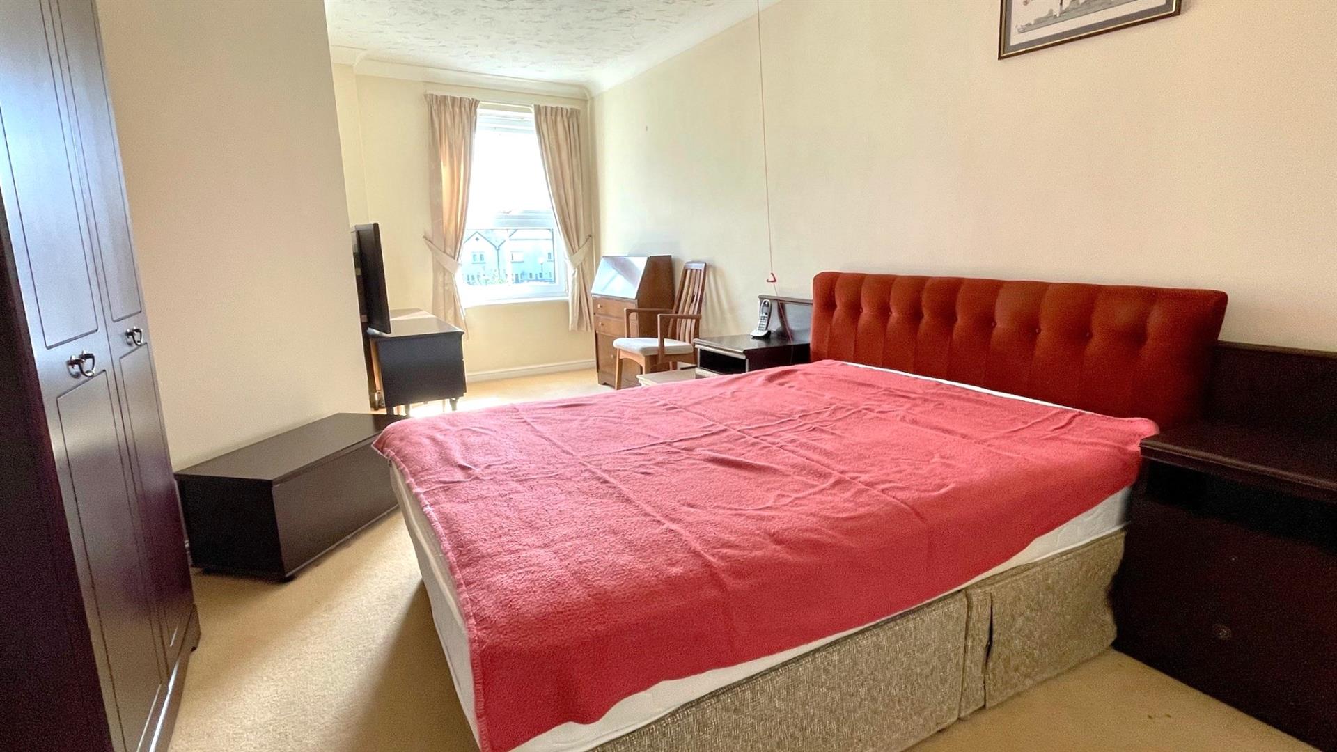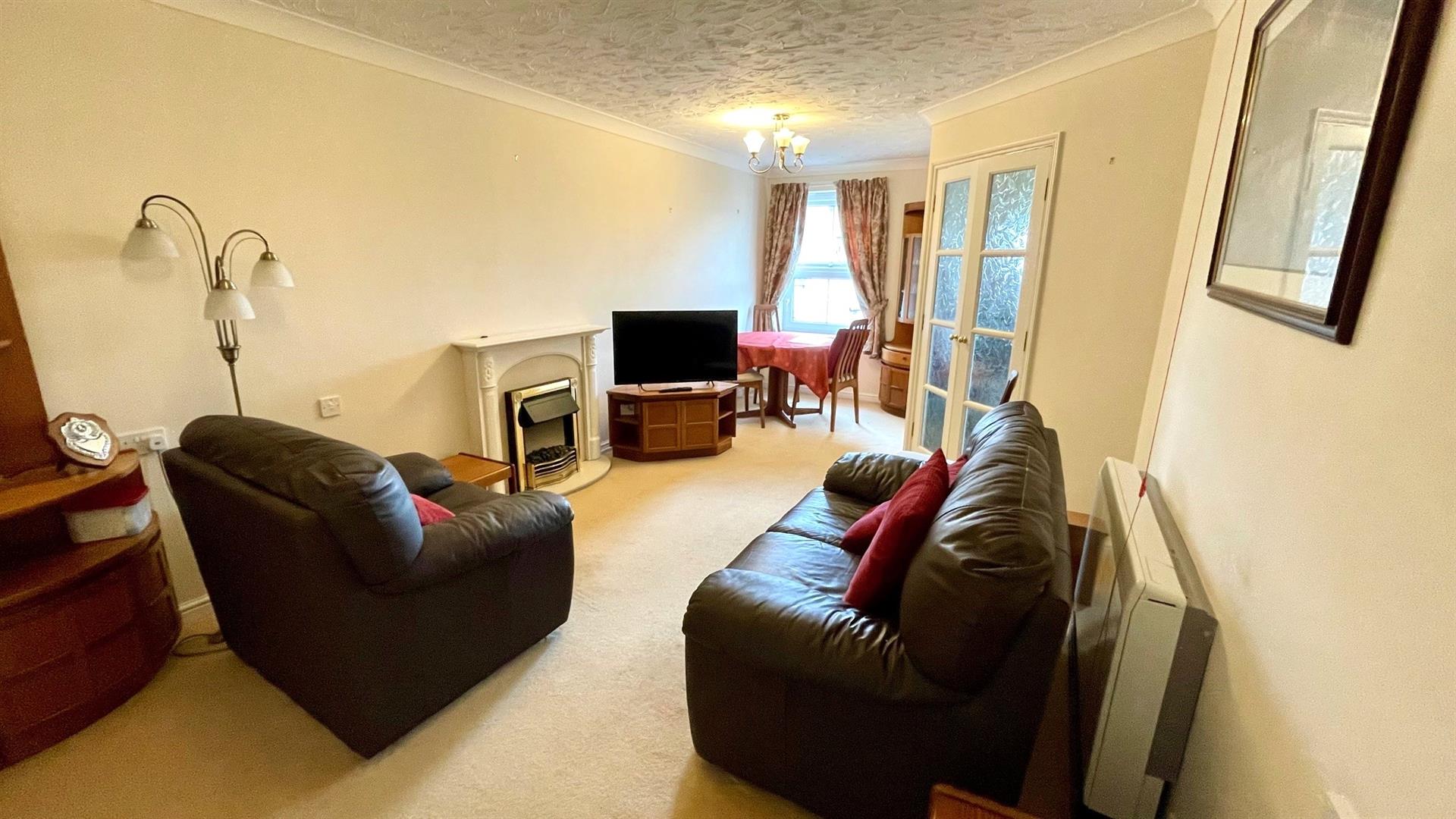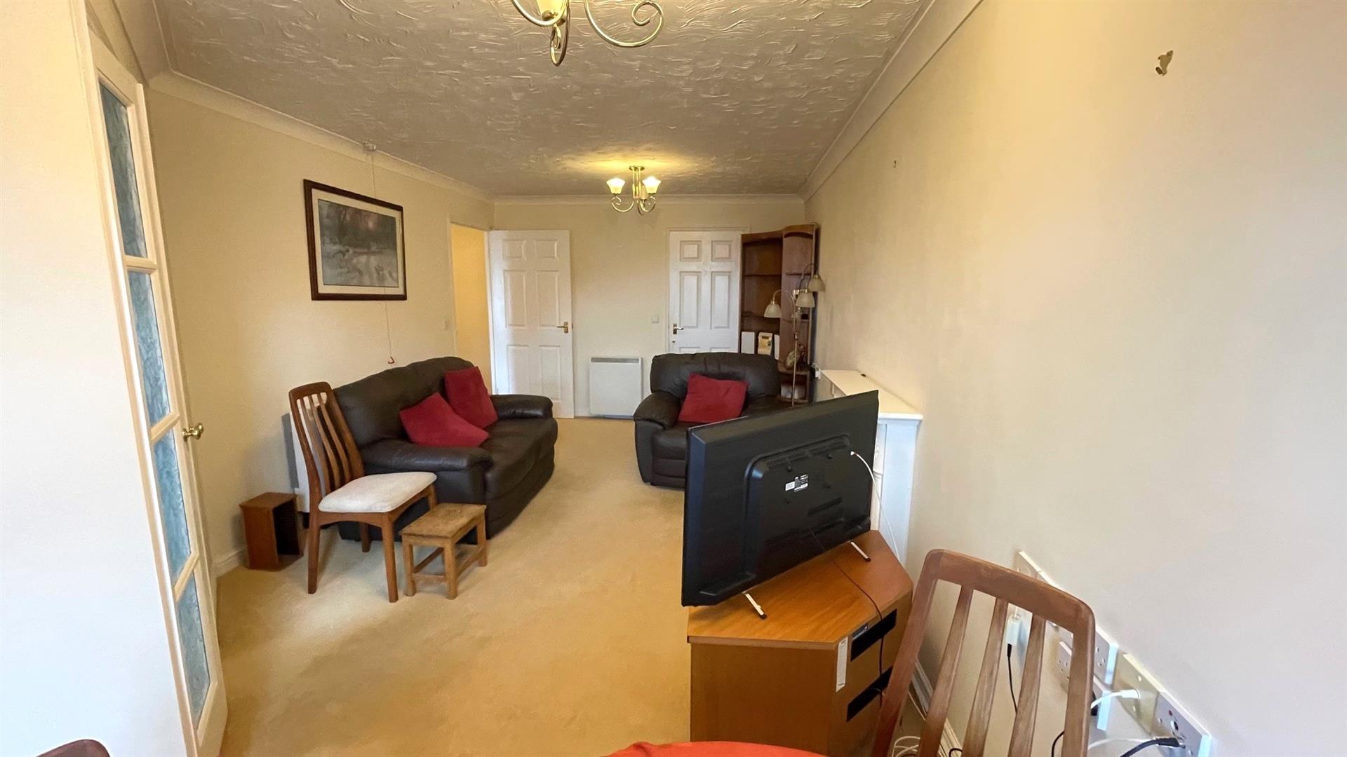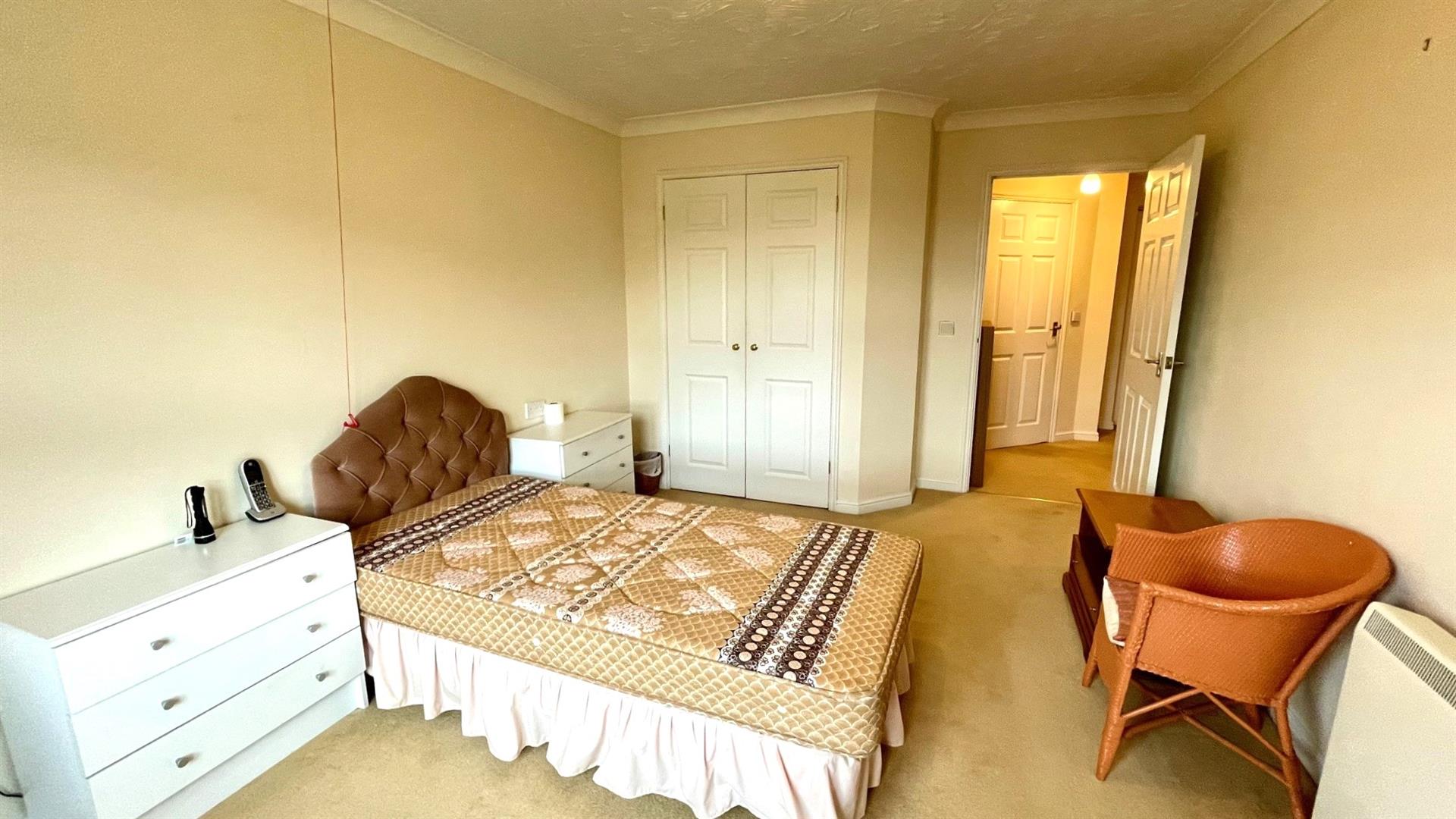 Fire place with flame effect fire, 2 storage heaters, coved ceiling, TV and telephone points, walk-in storage cupboard with shelving, Upvc double glazed window overlooking the garden, emergency pull cord, double opening door to:-