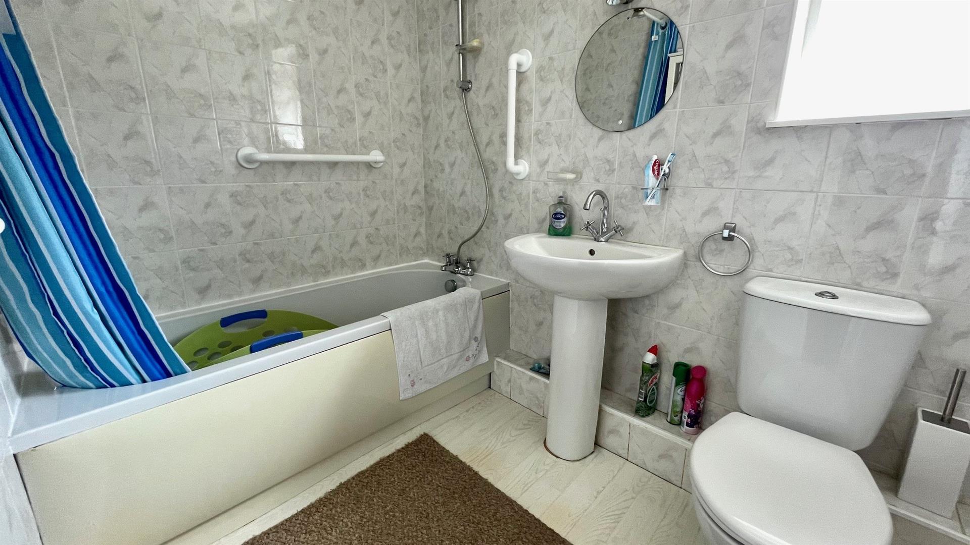 TILED 3 PIECE BATHROOMPanel bath with shower and mixer tap, pedestal wash hand basin and close couple w.c., ladder style towel warmer.