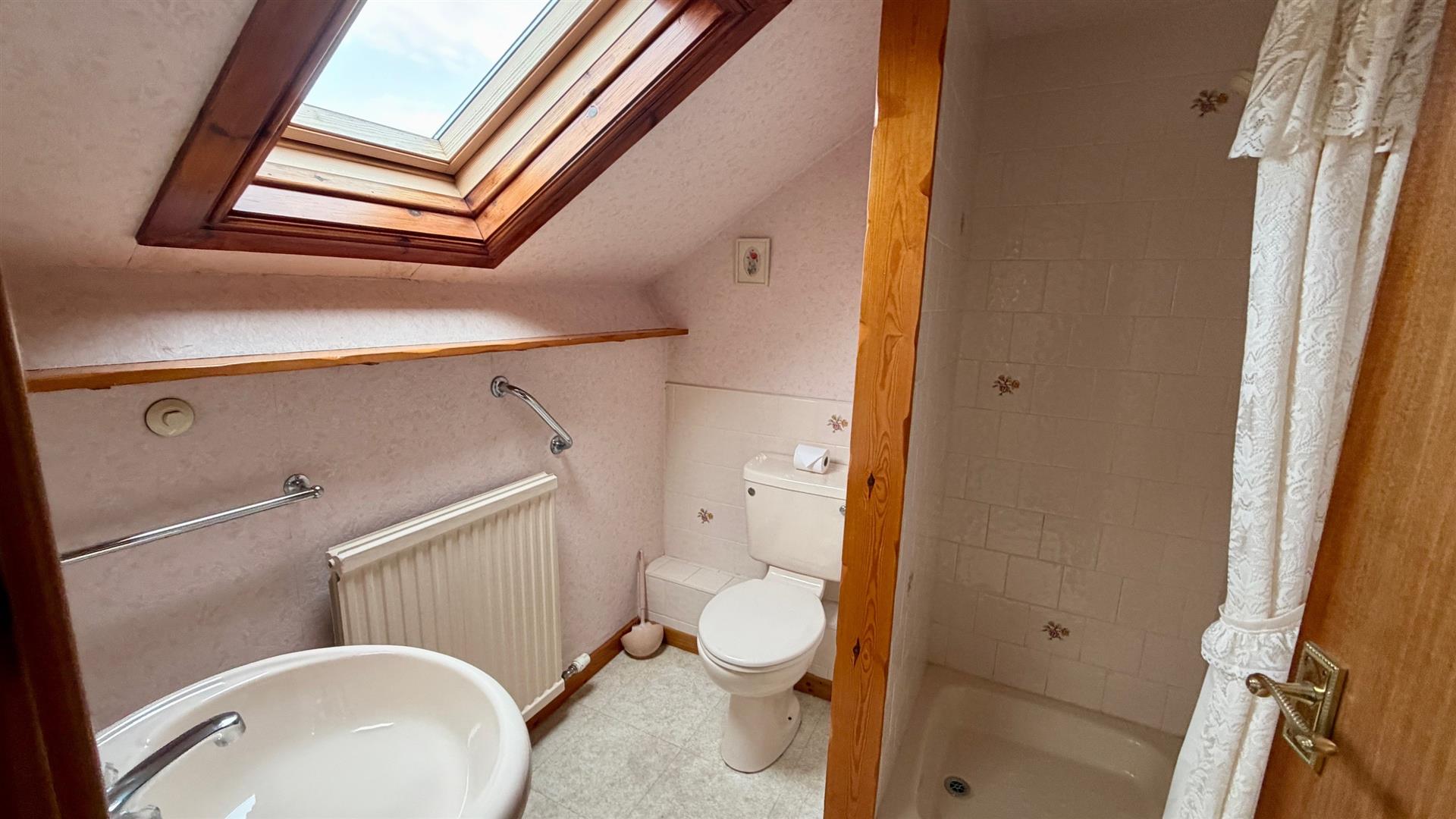 3-PIECE SHOWER ROOMComprising tiled shower stall with 'Mira' shower, pedestal wash hand basin, close coupled w.c, mirror and shaver light, double radiator, velux double glazed skylight window.
