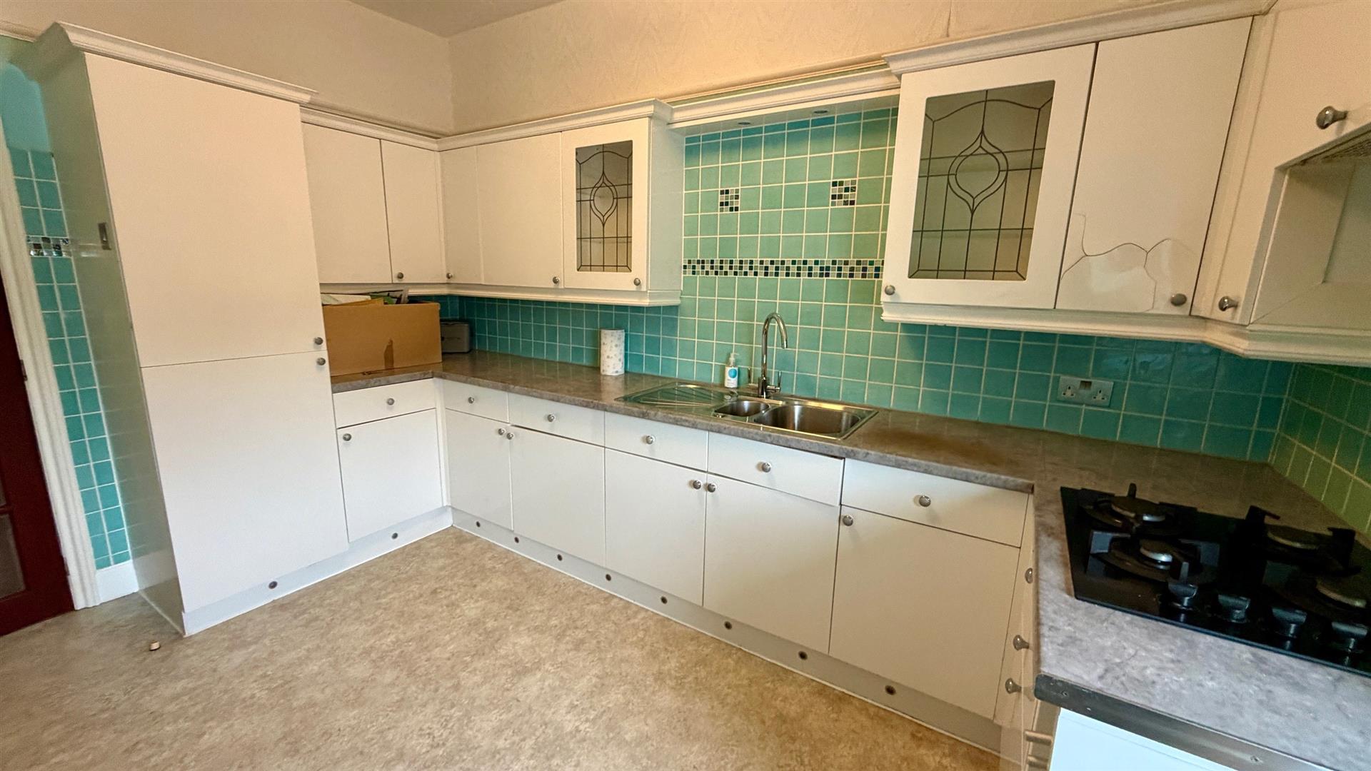 Fitted White base, wall, drawer, glass fronted and corner display units, round edge worktops, inset 1½ bowl sink unit and mixer taps, wall tiling, picture rail, 4 ring gas hob with cooker hood over, integraed fridge/freezer, upvc double glazed window.