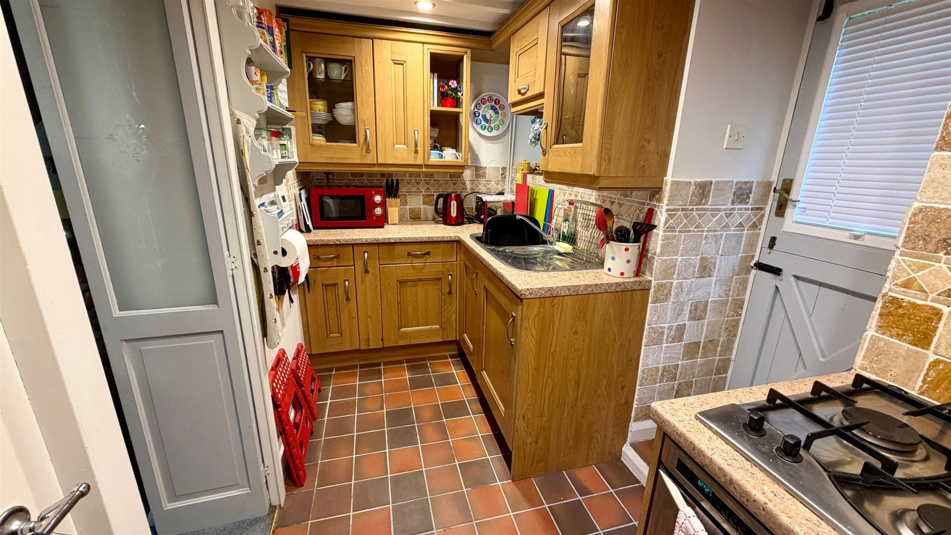 Base, wall and drawer units with complementary work tops incorporating inset stainless steel single drainer sink, built-in gas oven and grill with a gas hob above, integrated fridge/freezer, space and plumbing for washing machine, cupboard housing the gas fired central heating boiler, ceiling spotlights, power points including USB, radiator, stable door providing access to rear of the property.