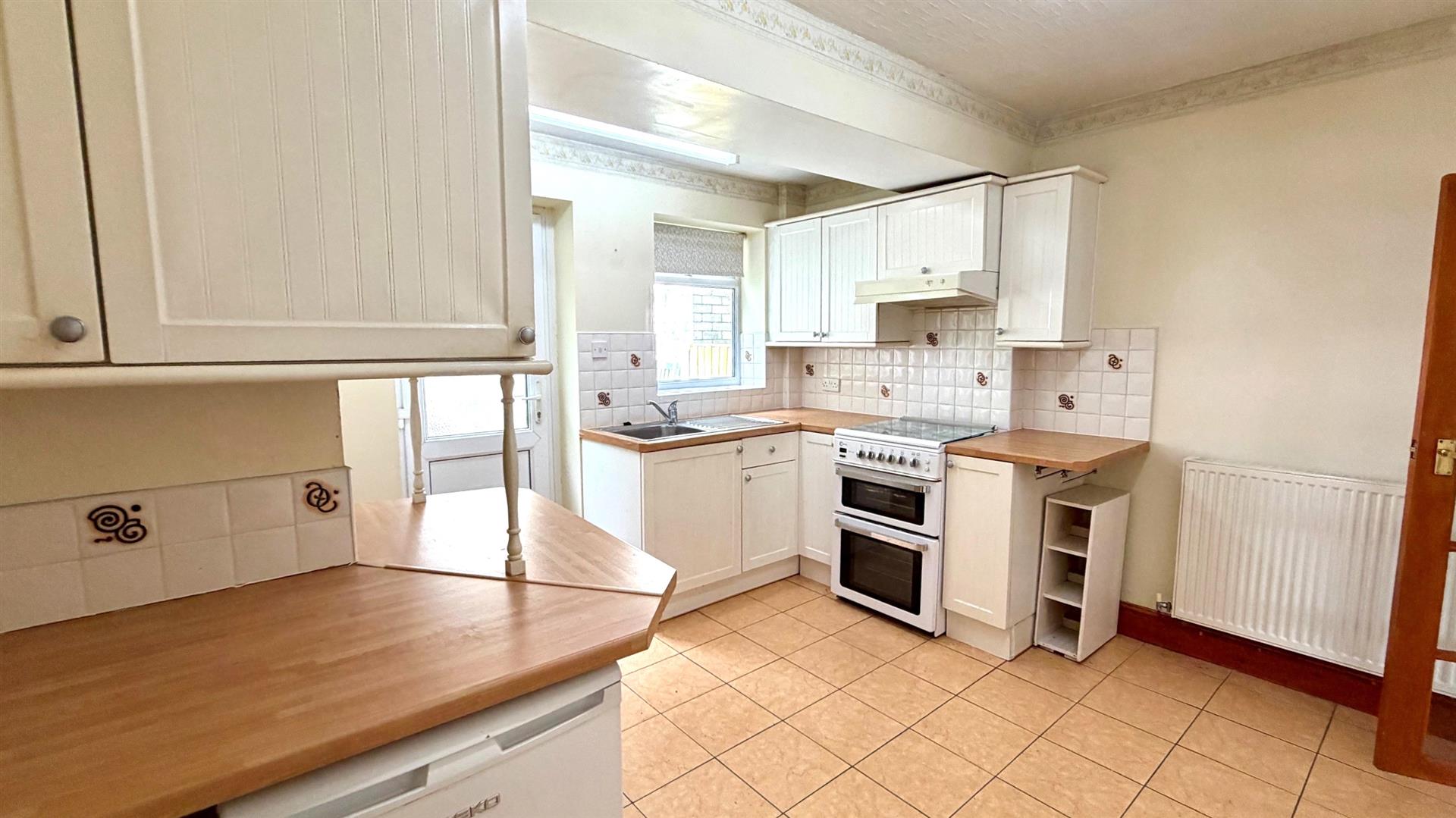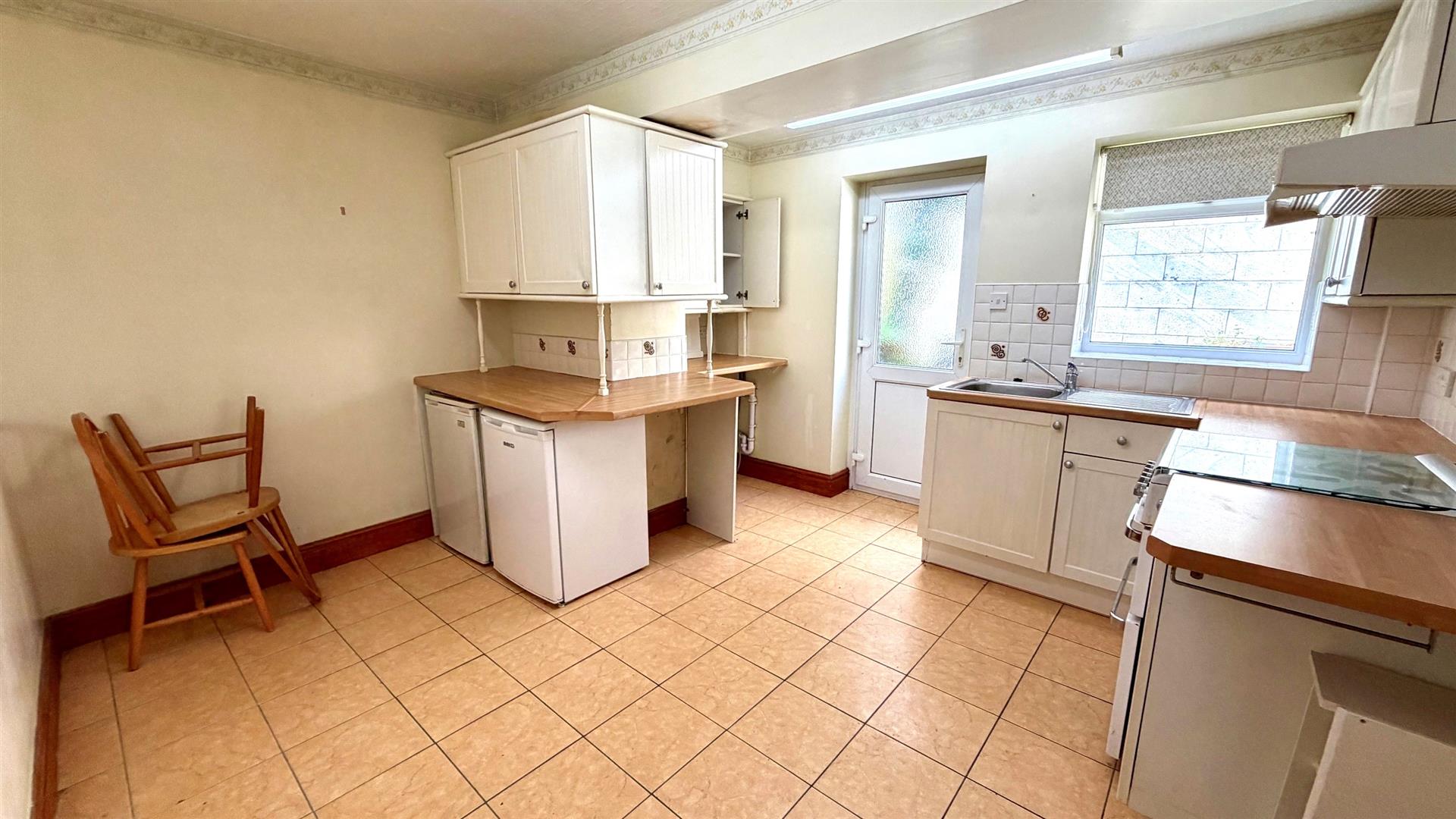 Fitted range of Cream shaker style base, wall and drawer units with round edge Beech effect worktops, single drainer sink unit and mixer tap, space for gas cooker, fridge and freezer, plumbing for a washing machine, round edge work surfaces. Wall and floor tiling, radiator, upvc double glazed window and upvc double glazed door to the rear.
