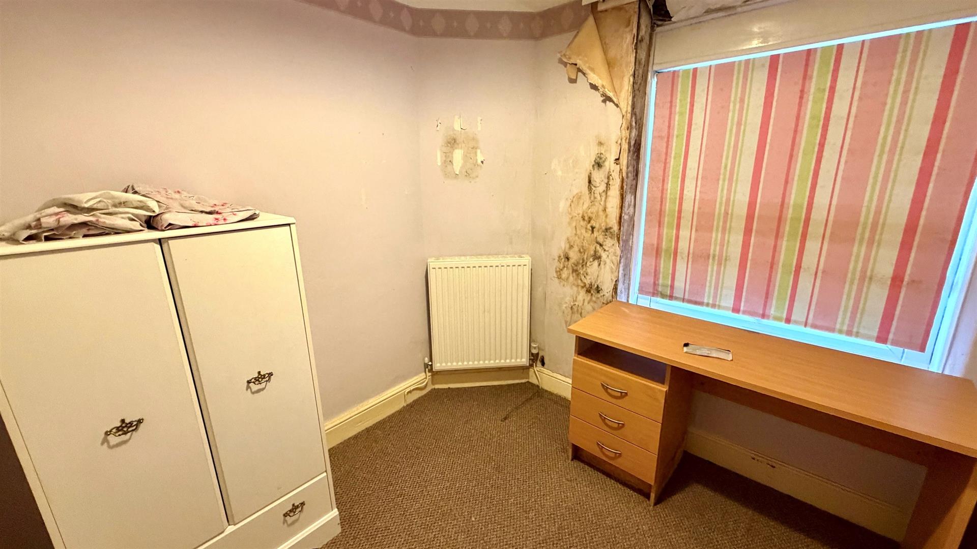 Built-in double wardrobe with hanging rails and shelving, radiator, upvc double glazed window to the front, hillside view, tiled sill.