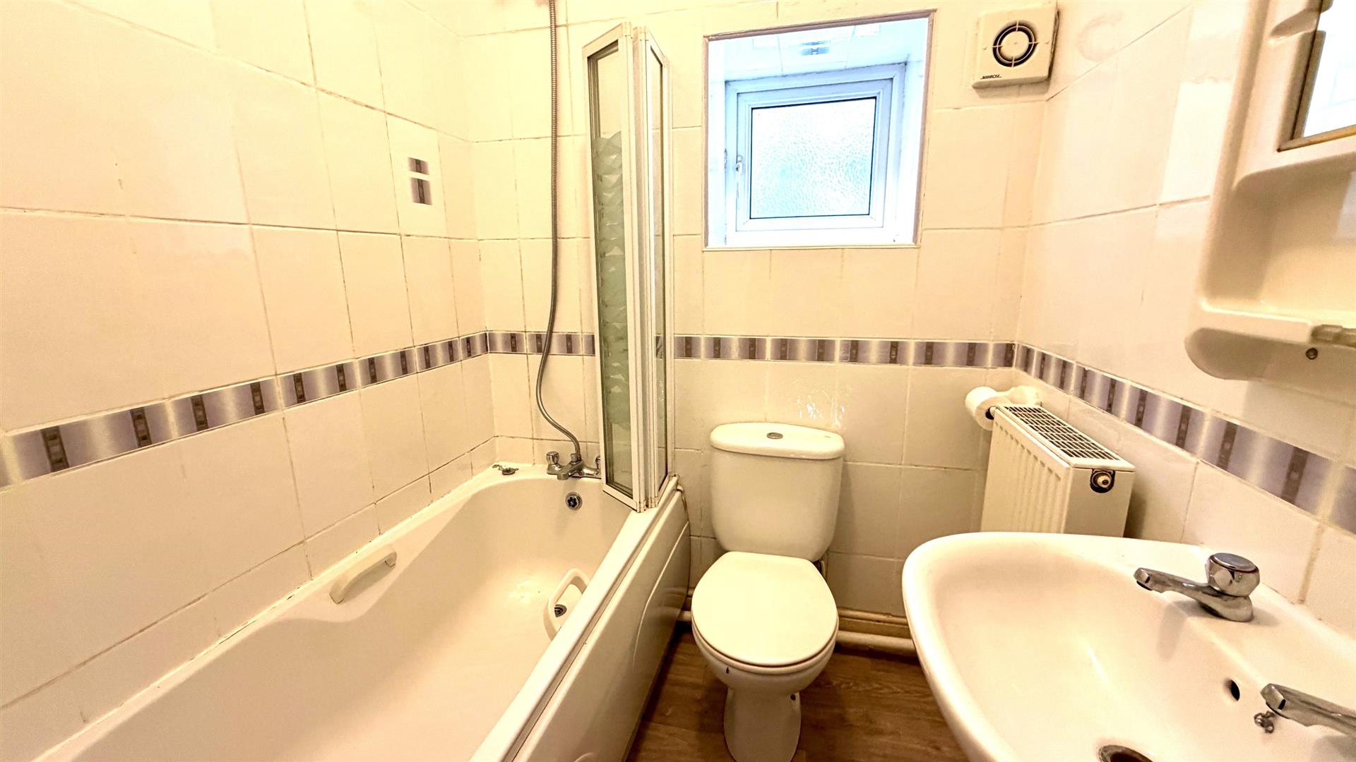3-PIECE BATHROOMWhite suite comprising panelled bath with mixer tap and shower attachment, folding side screen, pedestal wash hand basin, close coupled w.c, upvc double glazed window, double radiator.
