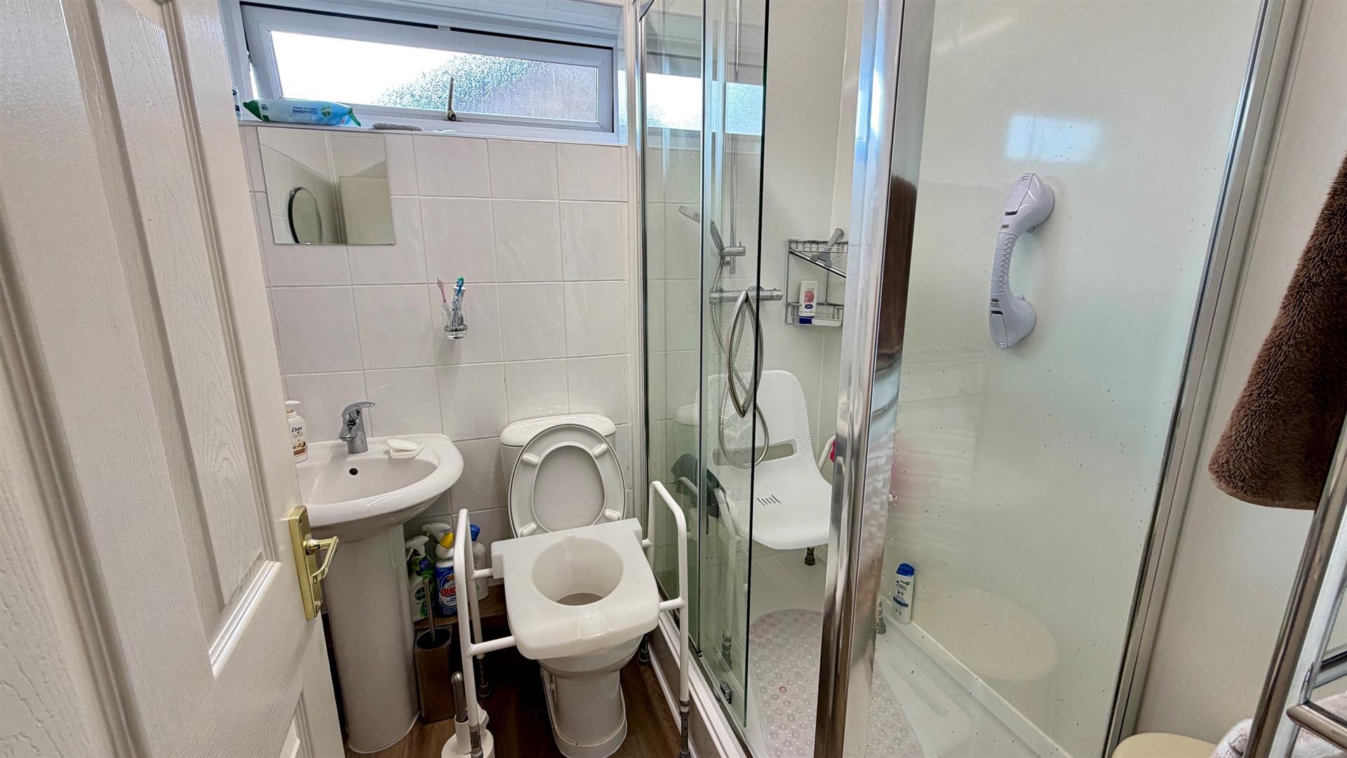3 PIECE SHOWER ROOMDouble shower stall with mains shower, pedestal wash hand basin and mixer tap, close coupled wc, wall tiling, shaver point, medicine cabinet, radiator, ladder style towel rail, upvc double glazed window, wood flooring.