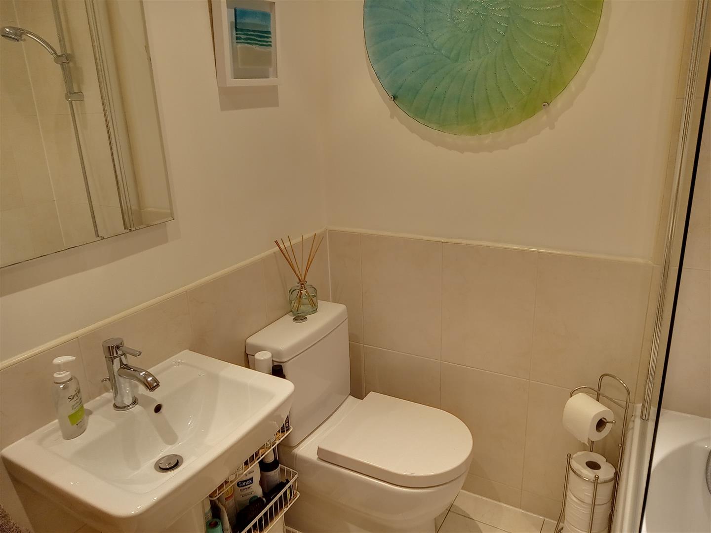3-PIECE BATHROOMWhite suite comprises panel bath with mixer tap and shower attachment, side shower screen, wash hand basin and mixer tap, close coupled w.c, wall and floor tiling, mirror, extractor, heated ladder style towel rail.