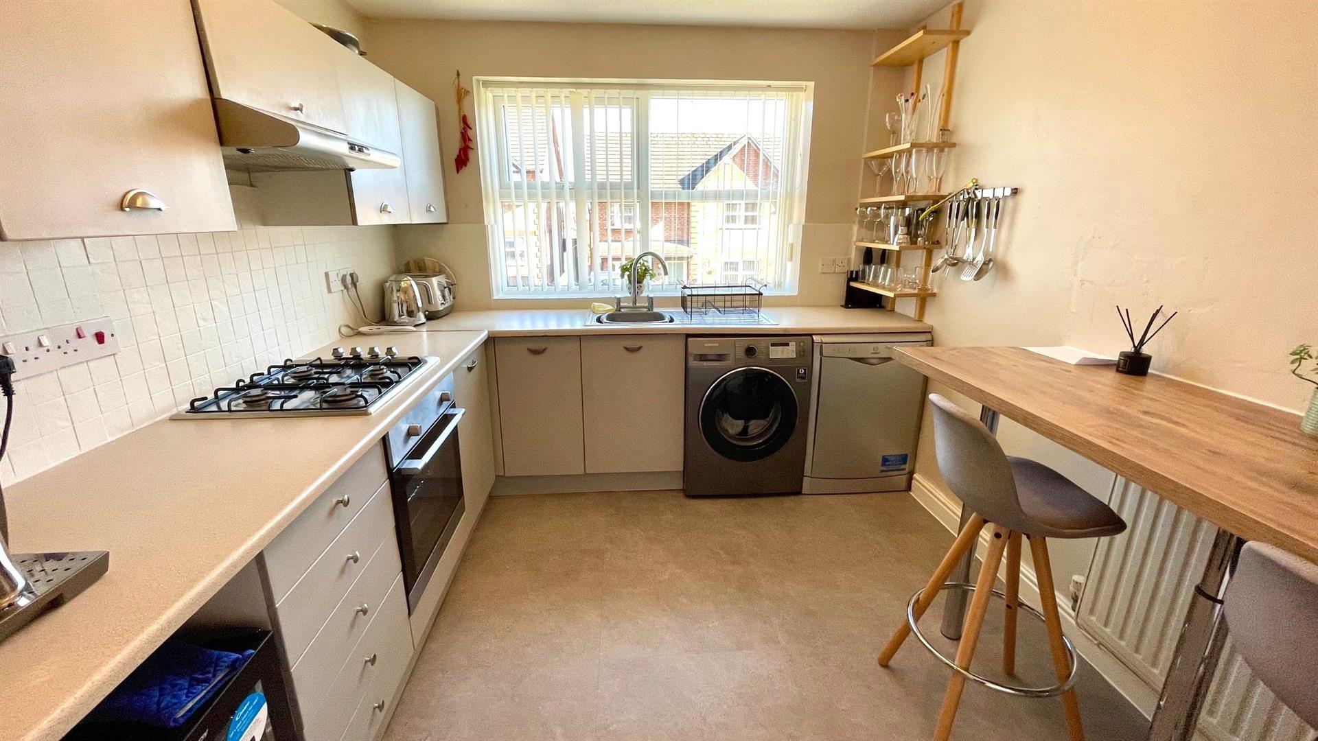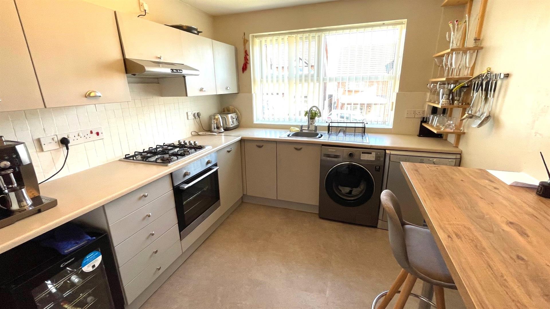 Fitted range of Grey fronted base, wall and drawer units with round edge speckle worktops incorporating single drainer sink unit and mixer tap, washing machine and dishwasher, integrated 'Logik' electric oven and 4 ring gas hob with cooker hood over, breakfast bar, wall tiling, wall mounted 'Glow worm' central heating and hot water boiler, 'Karndean' flooring, wall tiling, upvc double glazed window, double radiator. 2 steps down to:-