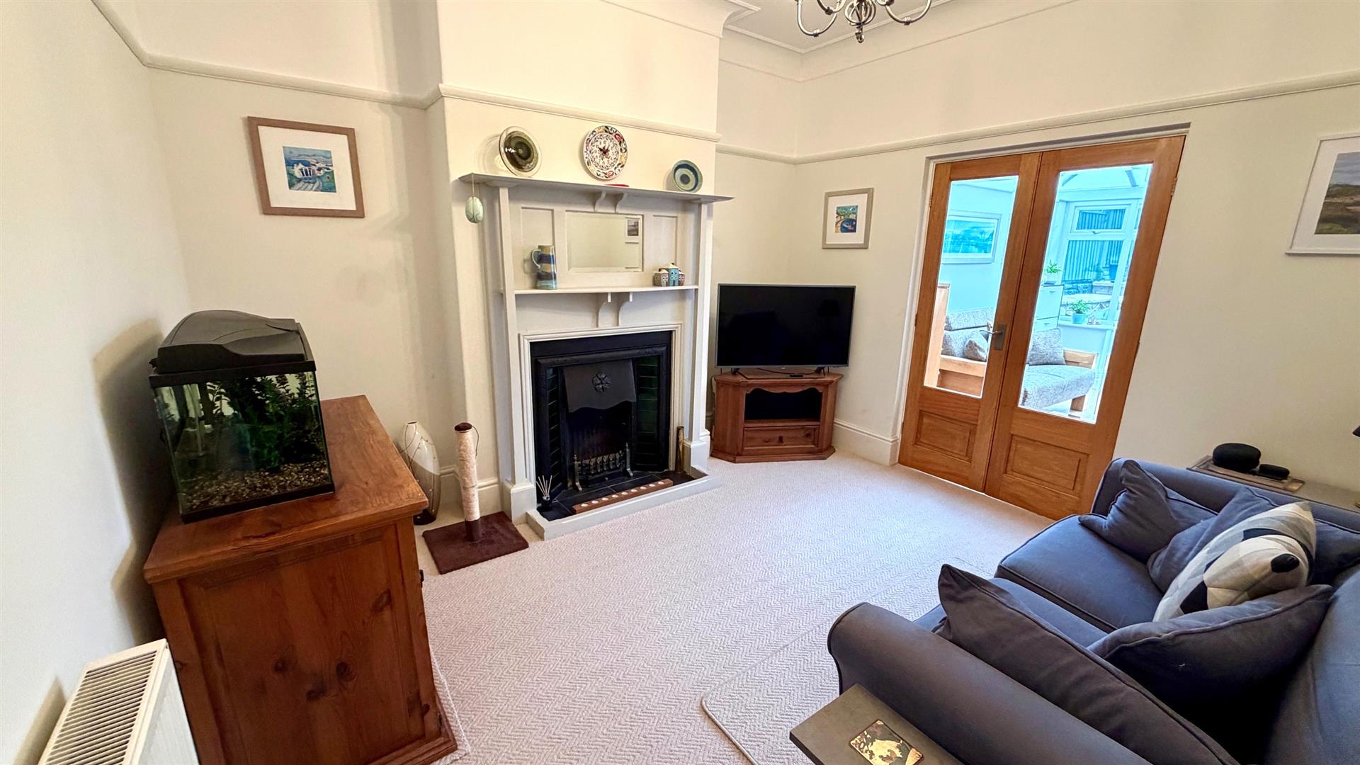 Radiator, tv point, coved ceilings, picture rails, feature fireplace with tiled inset display mantle with mirror and canopy, French doors to conservatory.