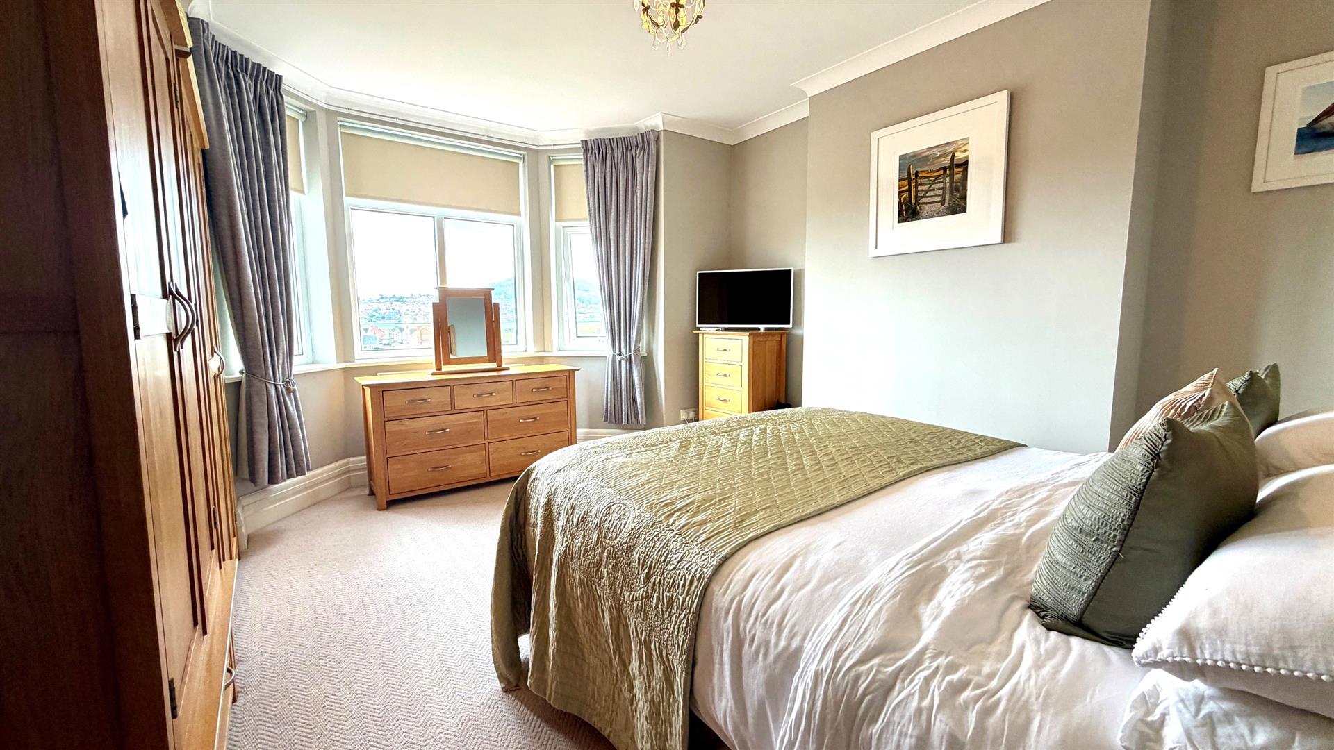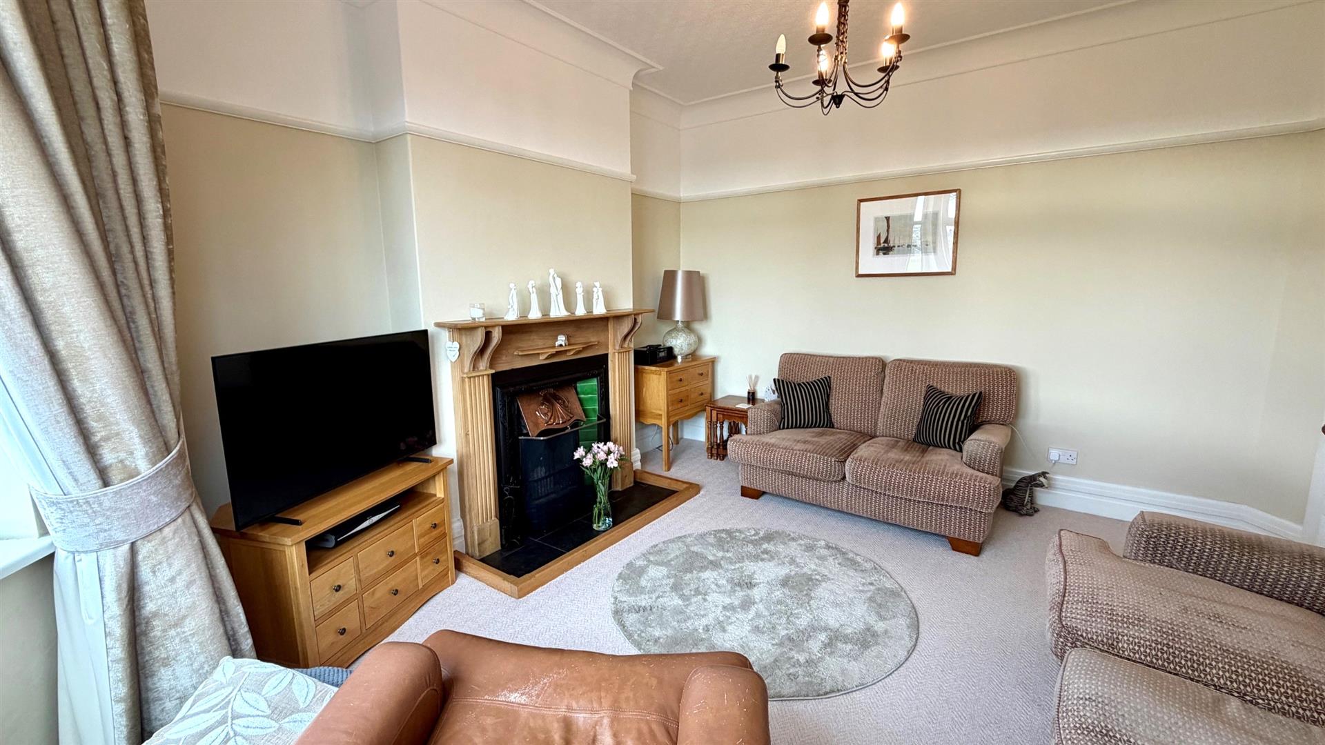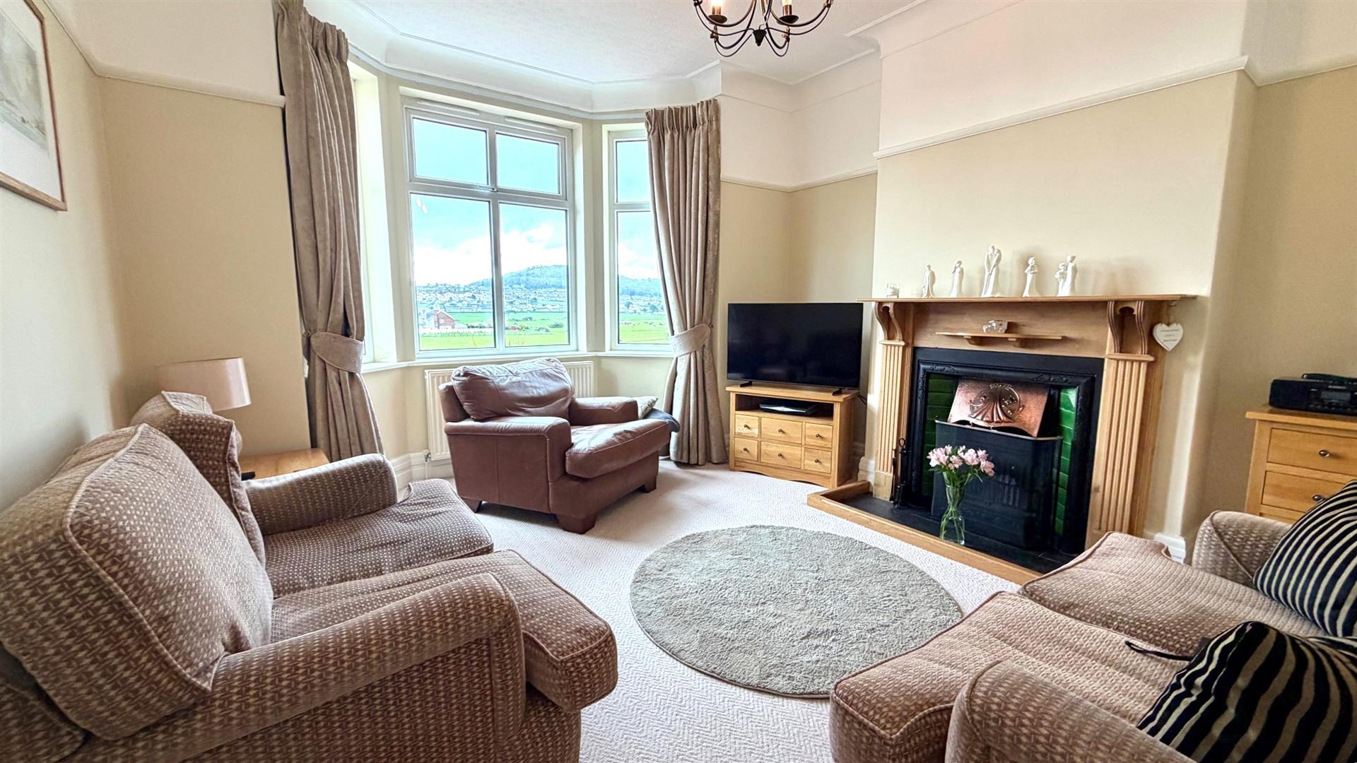 Upvc double glazed bay window to front overlooking fields and distant sea view, tv point, radiator, coved ceilings.