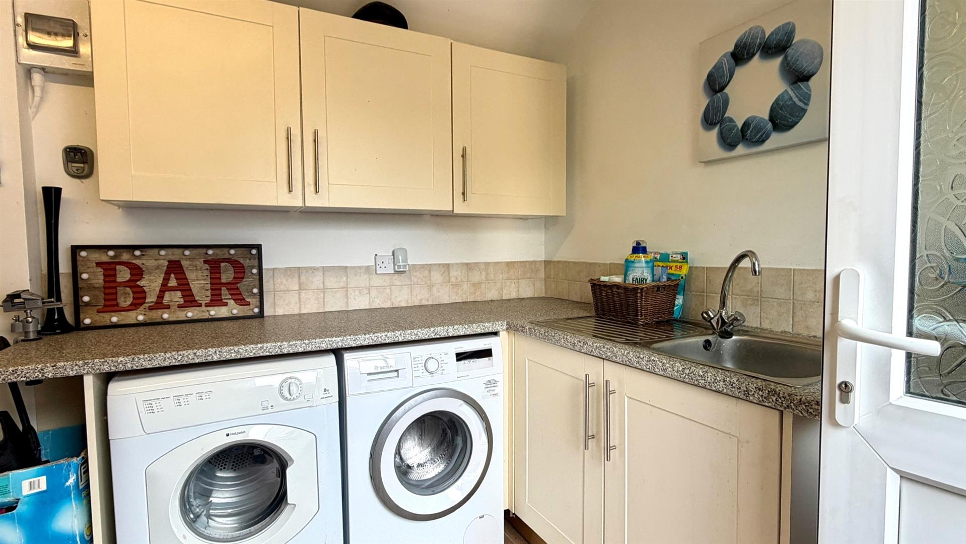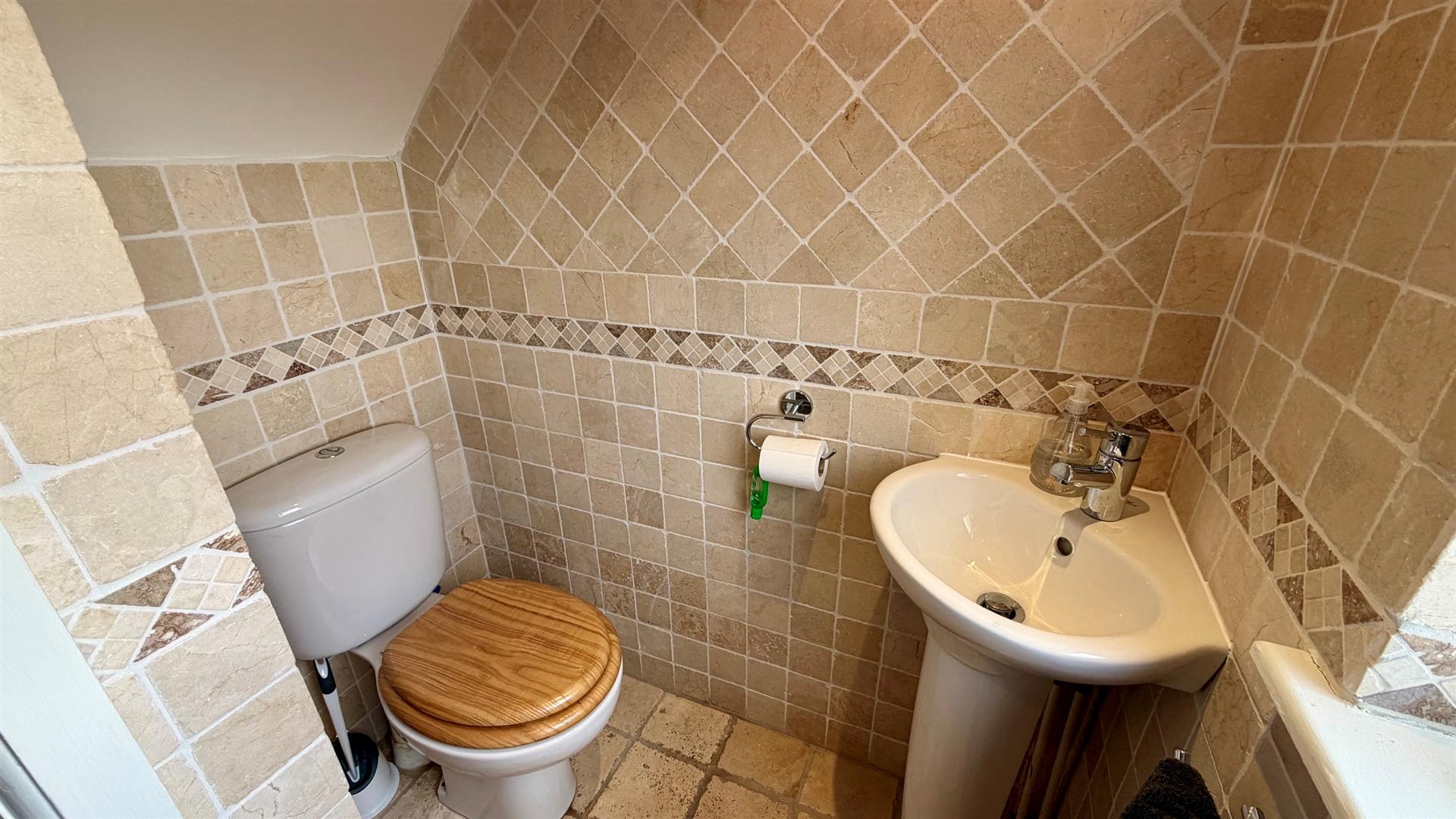 CLOAKROOMRadiator, upvc double glazed window, close coupled wc, vanity wash hand basin, tiled walls and floors, recessed downlighters.