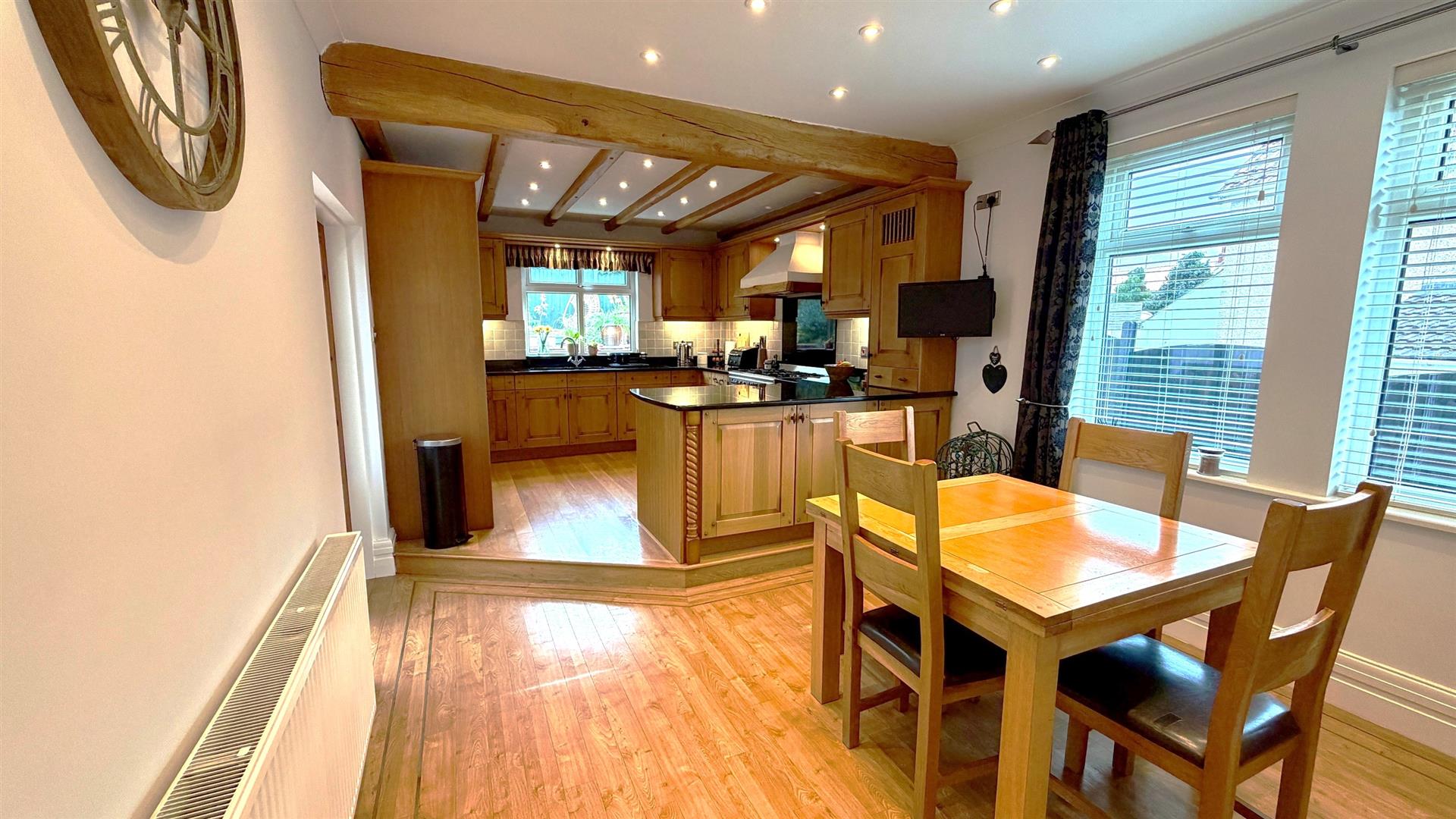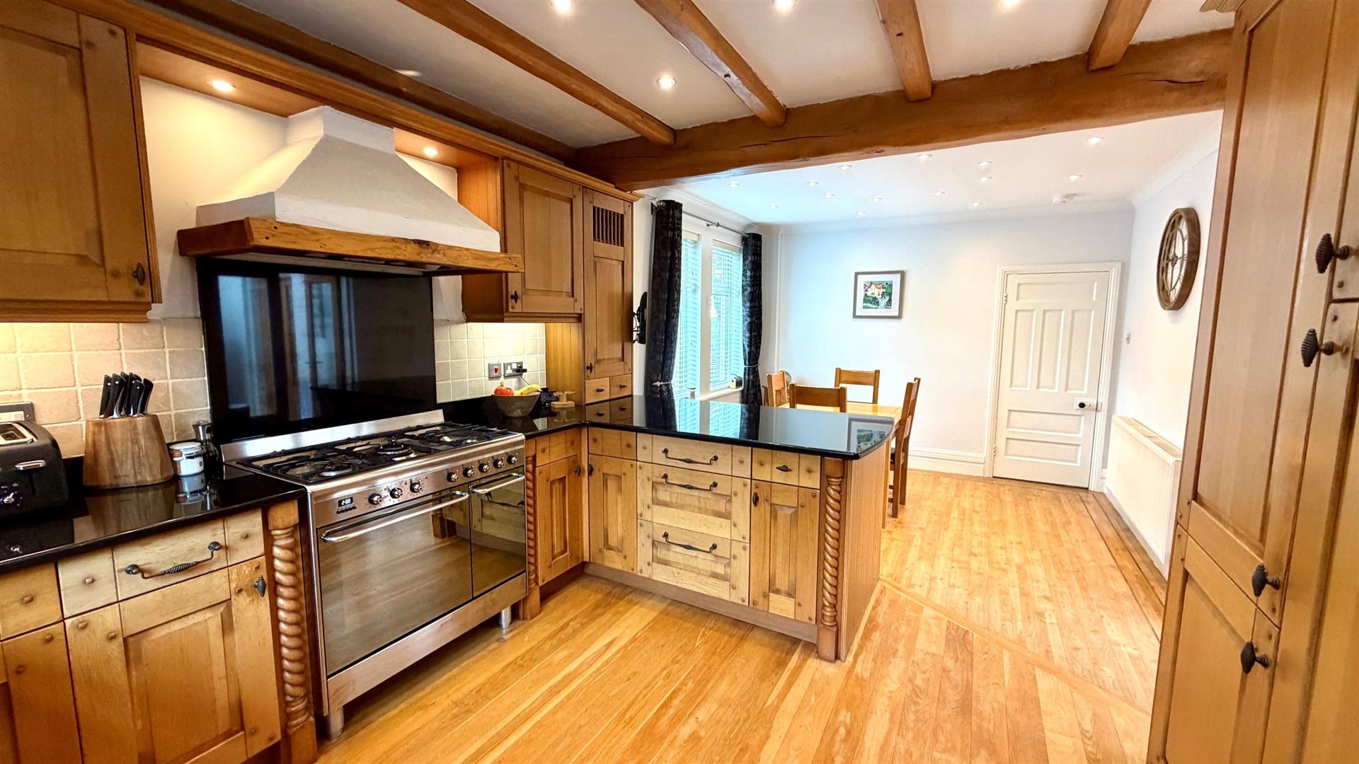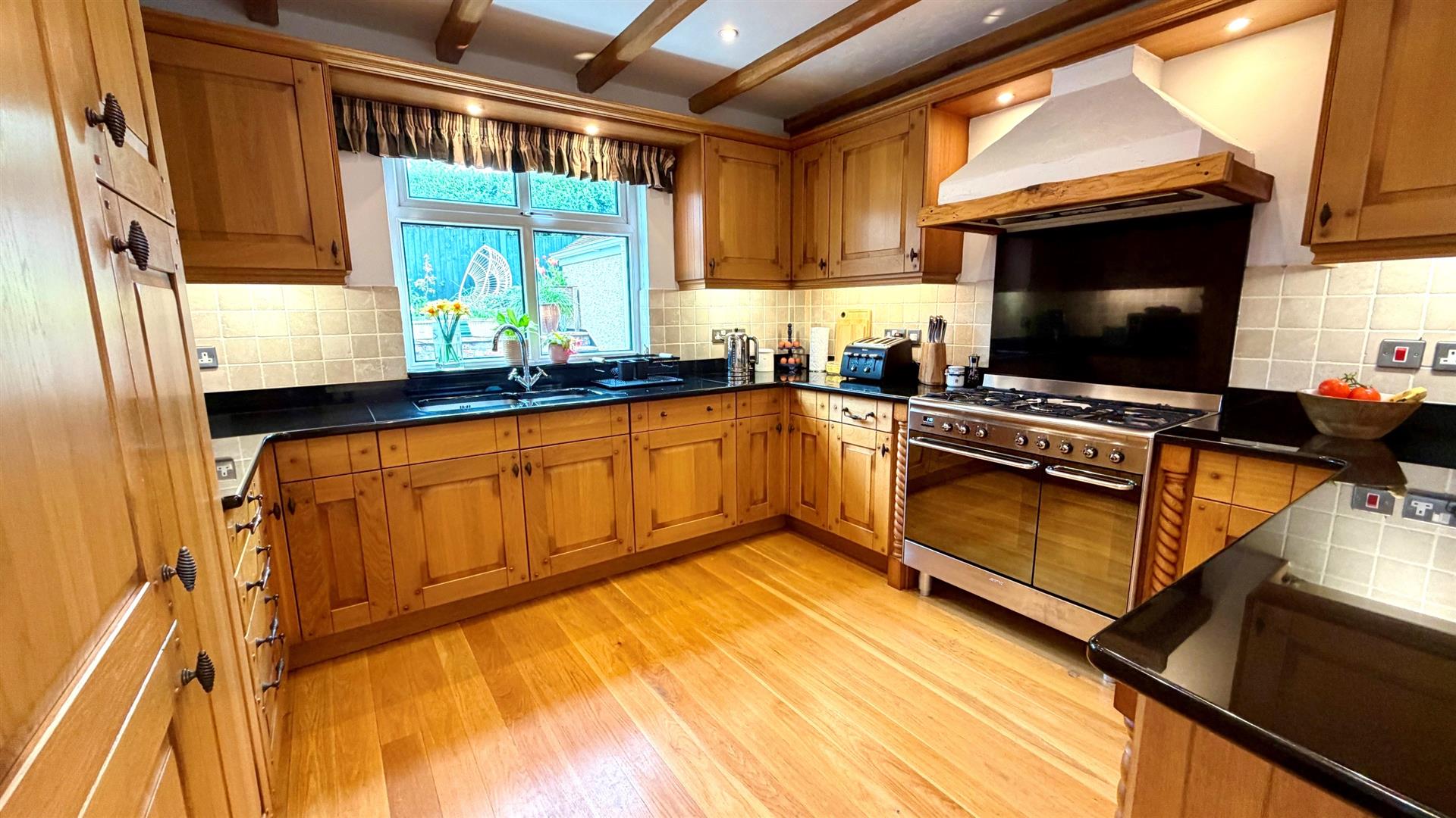 Fitted with range of oak fronted base, wall and drawer units, black granite worktops with upstands, double bowl stainless steel sink unit, double glazed window to rear garden, beamed ceilings and recessed LED ceiling lighting, radiator, double glazed side window, integrated 'Neff' dishwasher, integrated 'Smeg' fridge/ freezer, larder cupboard, 'Smeg' cooking range with double electric oven, 5 ring gas hob and granite splashback, with extractor canopy over, 'Karndean' flooring to breakfast area and solid oak flooring to kitchen area, wall tiling.