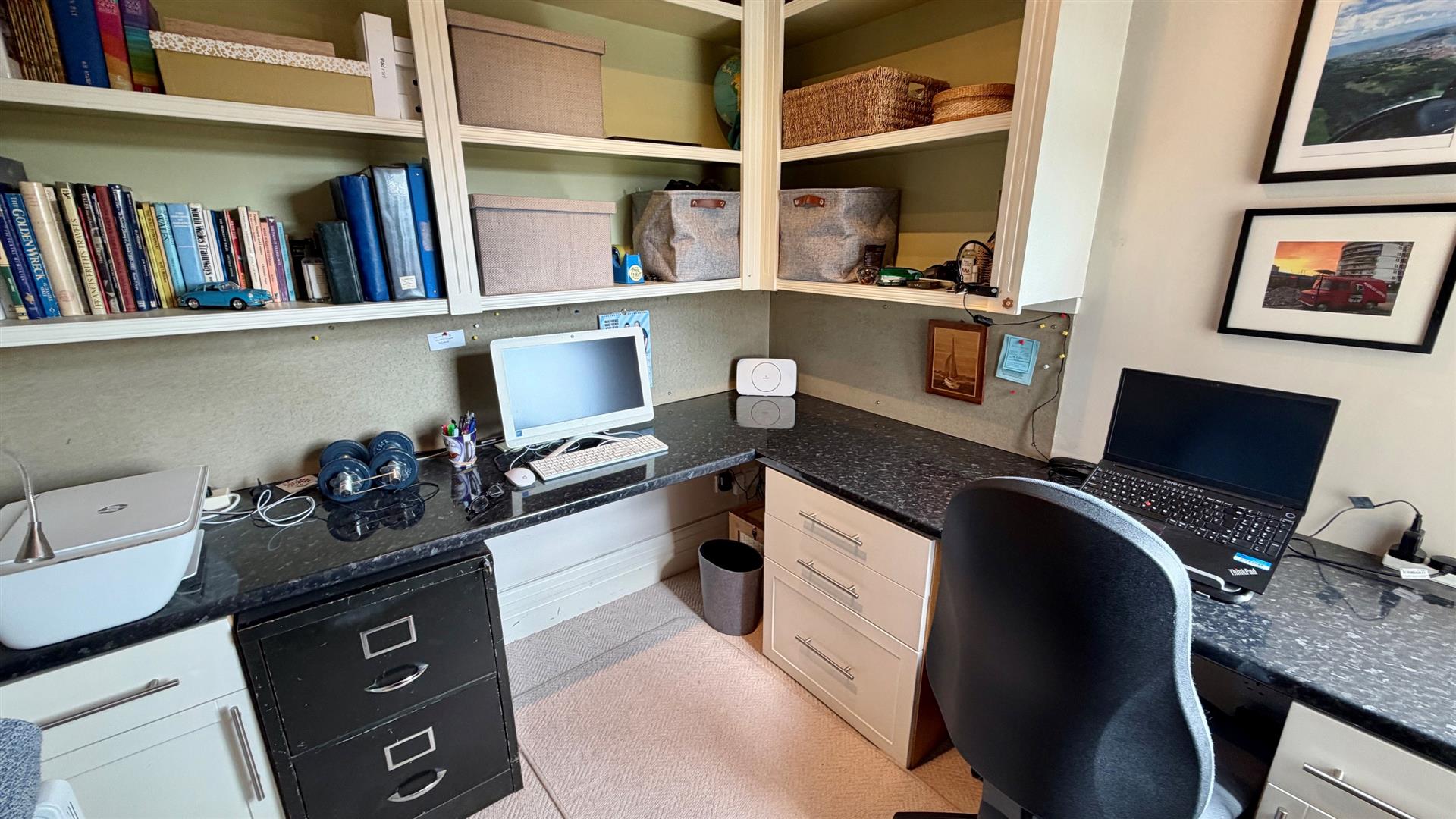 Upvc double glazed window, radiator, double built in storage units, shelving, coving, spotlights.