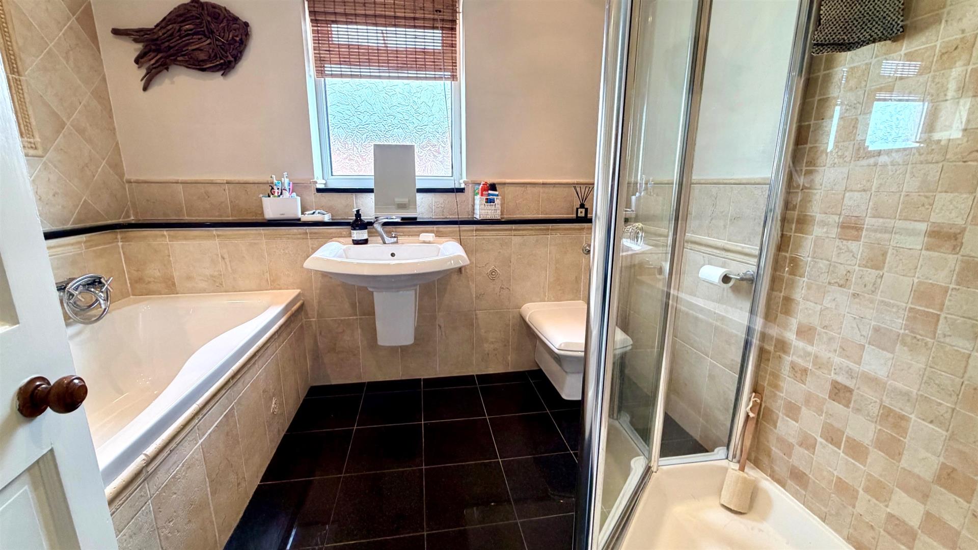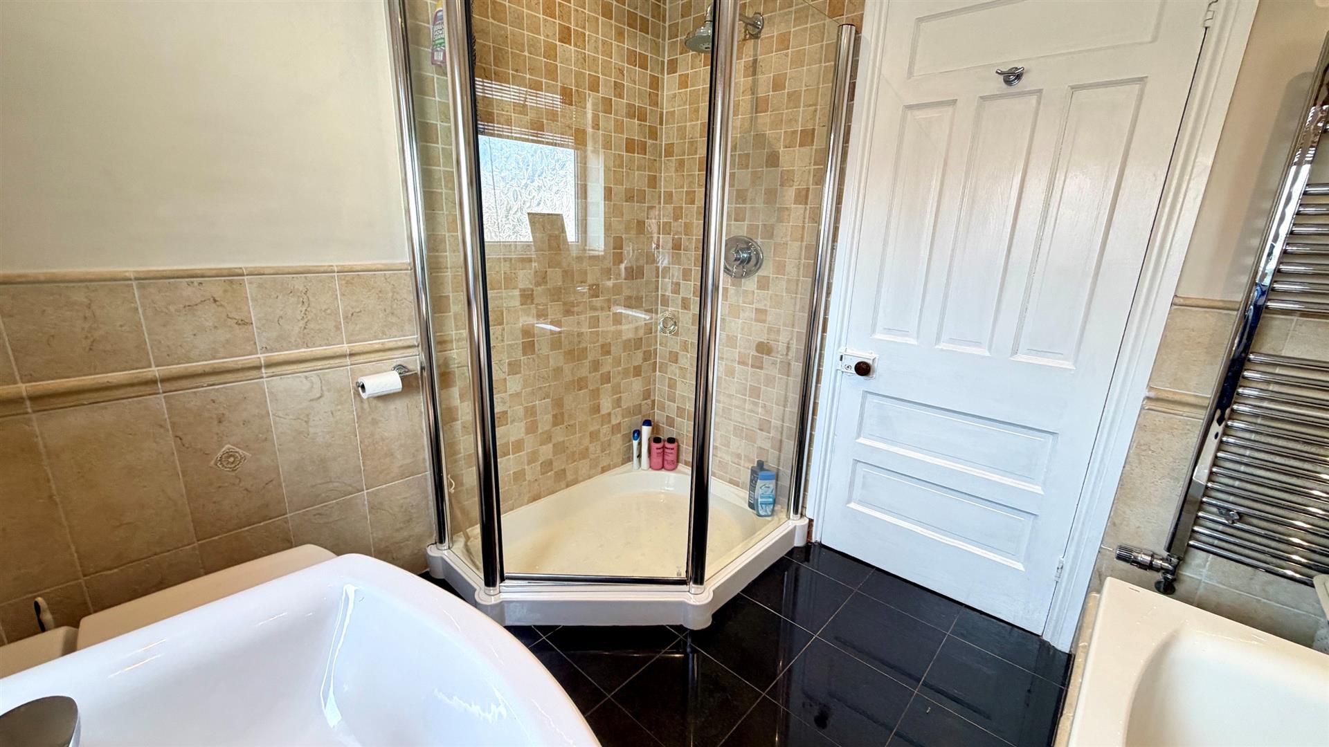 White panel bath and shower taps, vanity wash hand basin, close coupled wc, corner 'Matki' shower cubicle, towel radiator, upvc double glazed window, large wall mirror, black granite tiled floor, half tiled walls, coving, recessed downlighters, extractor, upvc double glazed window.